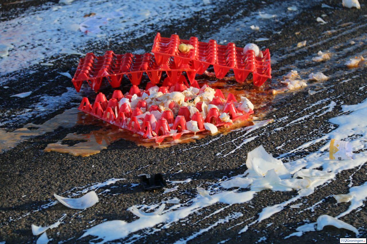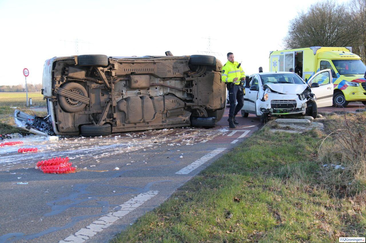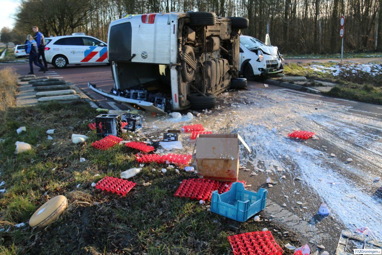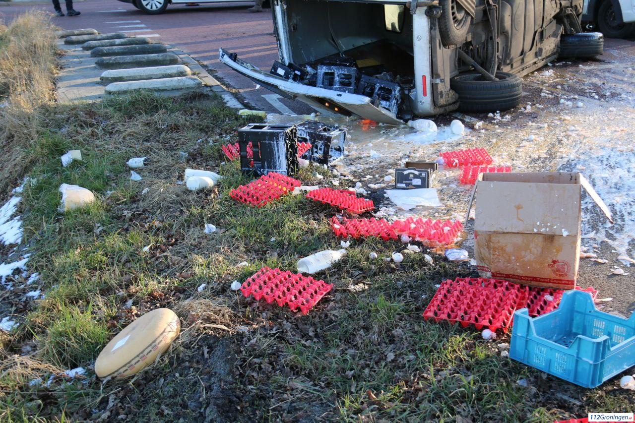 Door de klap is een bestelbus volgeladen met vers artikelen gekanteld. De hulpdiensten waren snel ter plaatse. De weg was tijdelijk afgesloten en lag bezaaid met melk eieren en kaas. Niemand raakte gewond.