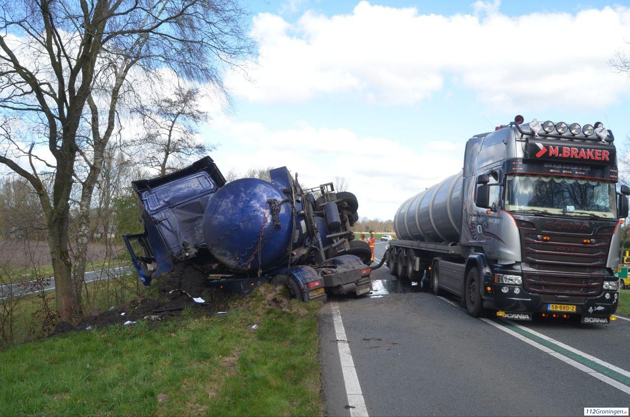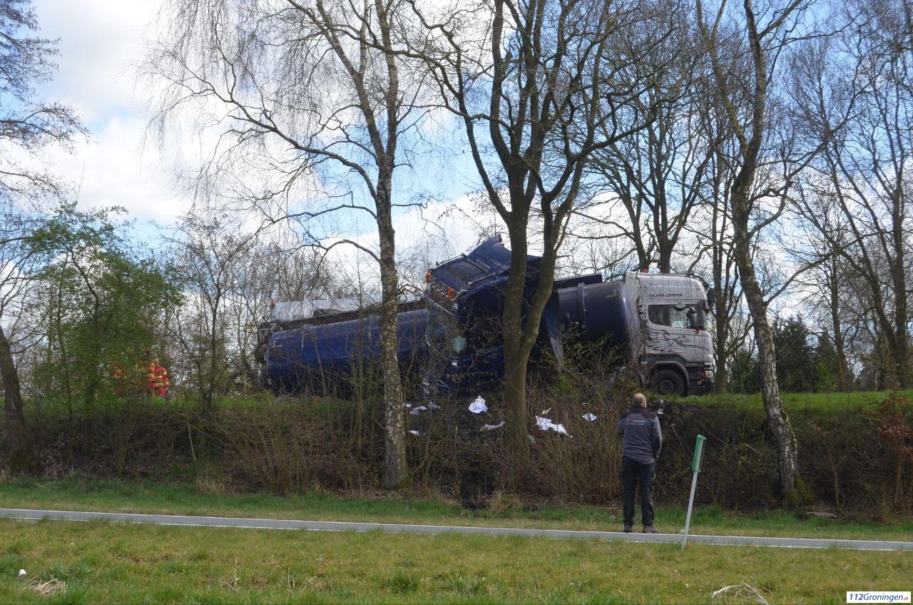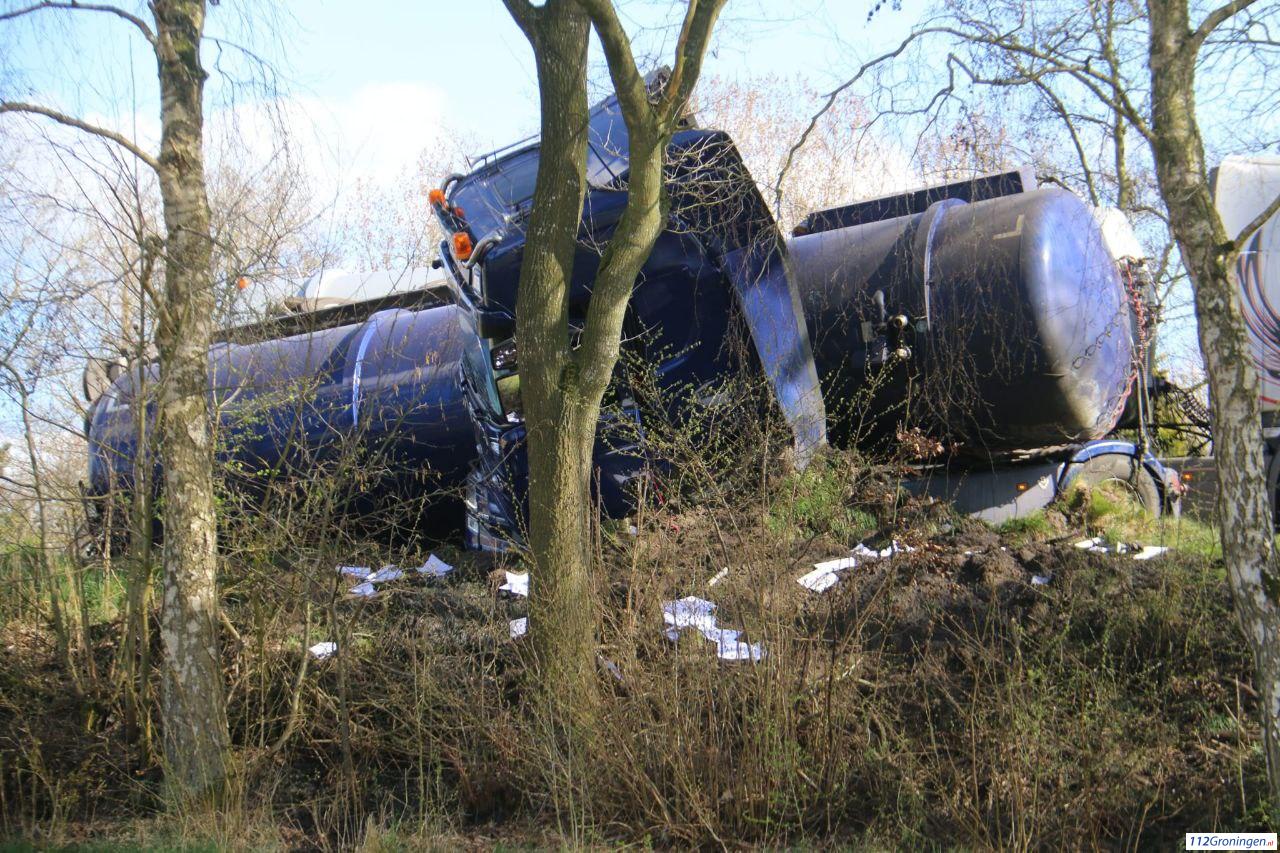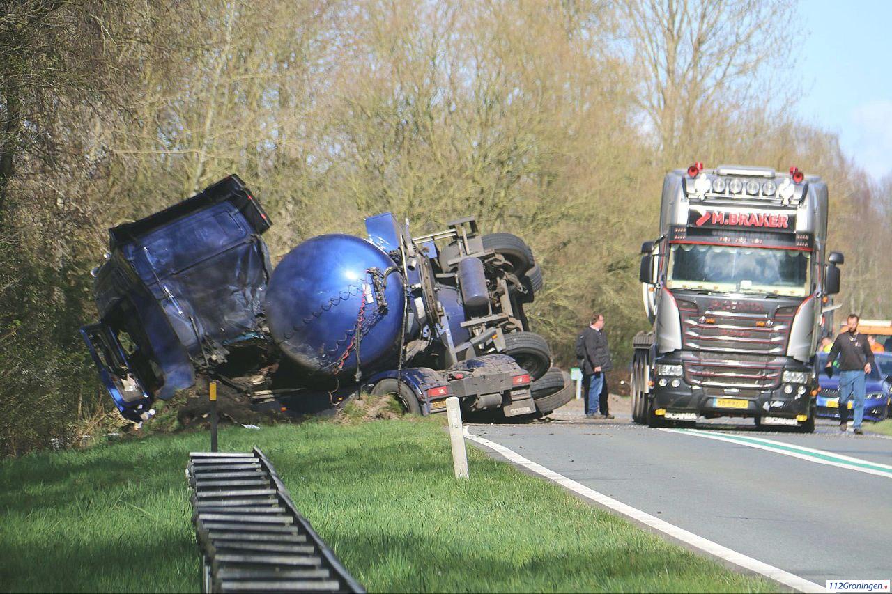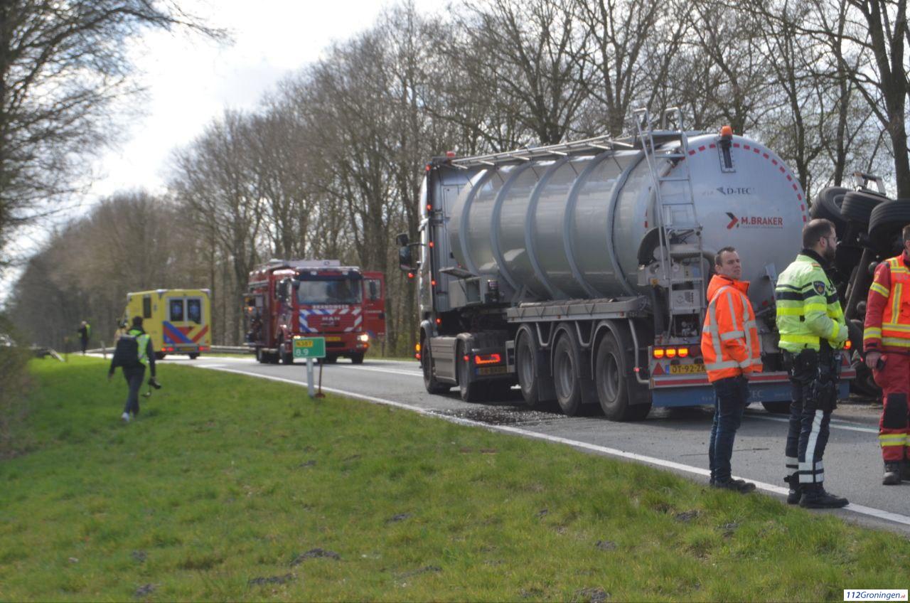 Een tankwagen geladen met mest is geschaard, deels gekanteld en ligt dwars over de weg. De weg is daardoor volledig geblokkeerd.