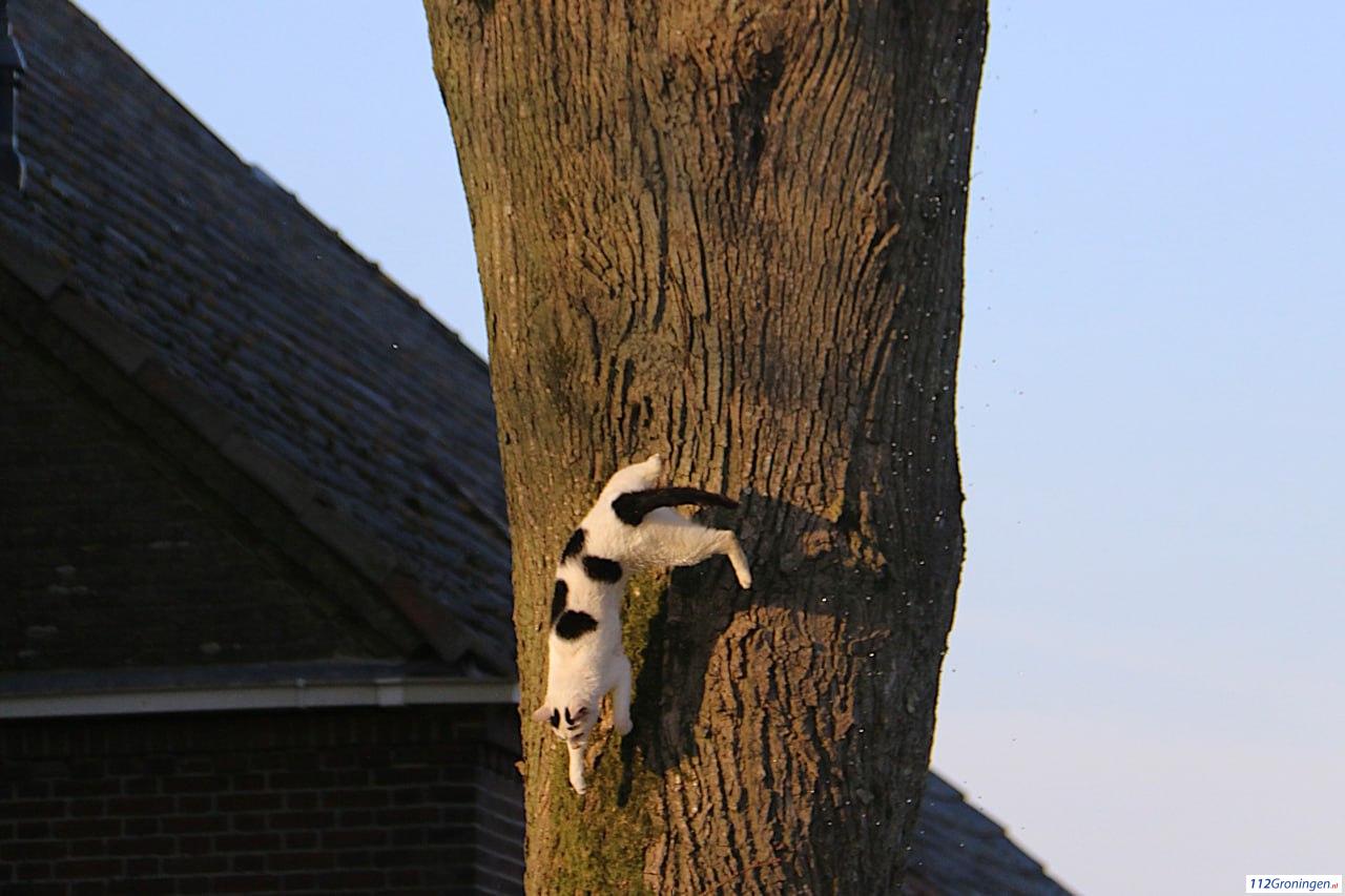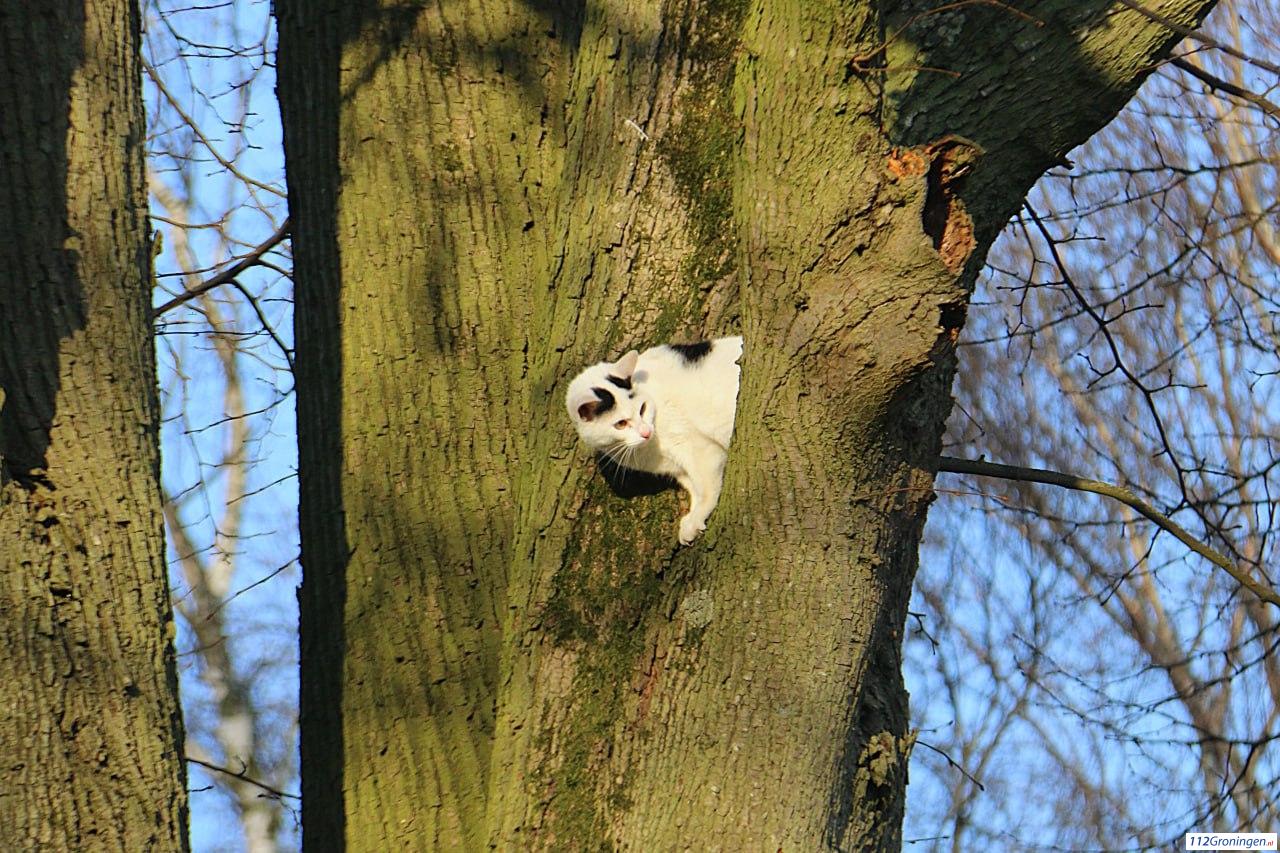 Veendam – Aan het eind van de middag werd de brandweer gealarmeerd voor een dier in nood aan de Ommelanderwijk. Een kat zat daar al enkele dagen vast op grote hoogte in een boom.