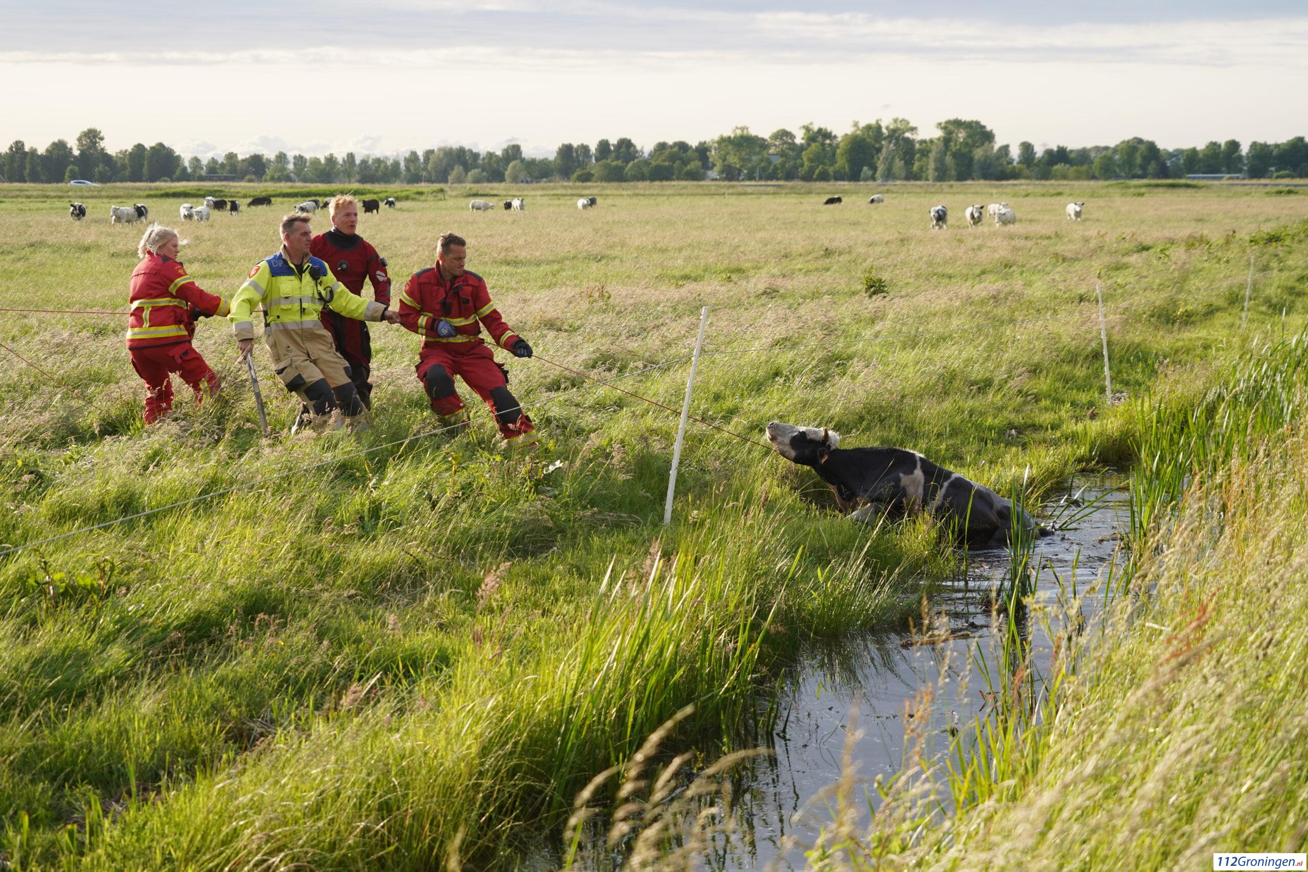 Ter plaatse bleek er een koe ter water te zijn geraakt. De brandweer heeft de koe uit de sloot getrokken met behulp van brandweerslang.
