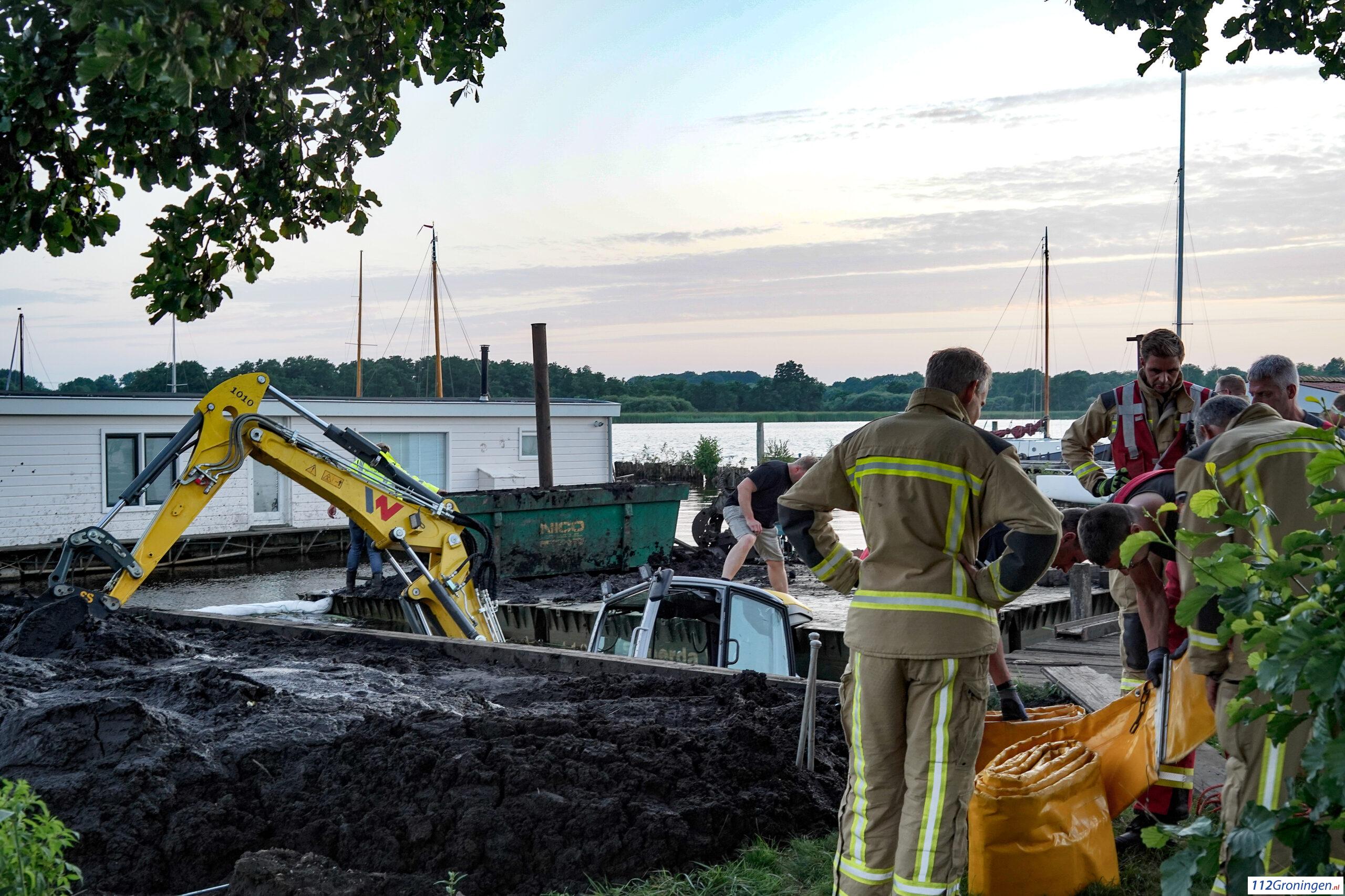 Midlaren – Vrijdagavond is bij de haven van Paviljoen Meerzicht in Midlaren een graafmachine van een ponton afgegleden en in het water terechtgekomen.