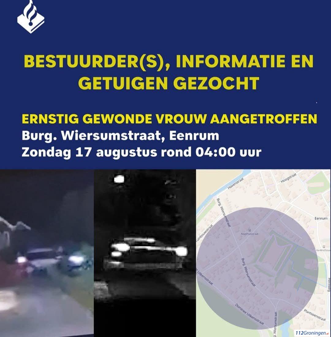 Op camerabeelden zien we rond 04.00 uur twee voertuigen in de Burgemeester Wiersumstraat rijden. Mogelijk betreft het hetzelfde voertuig, dat is nog niet duidelijk. Gezien het tijdstip zo kort voor het aantreffen van de vrouw, komen we uiteraard graag met de bestuurder(s) in contact. Bent u de bestuurder, of weet u wie de bestuurder is, dan horen wij dat graag.
