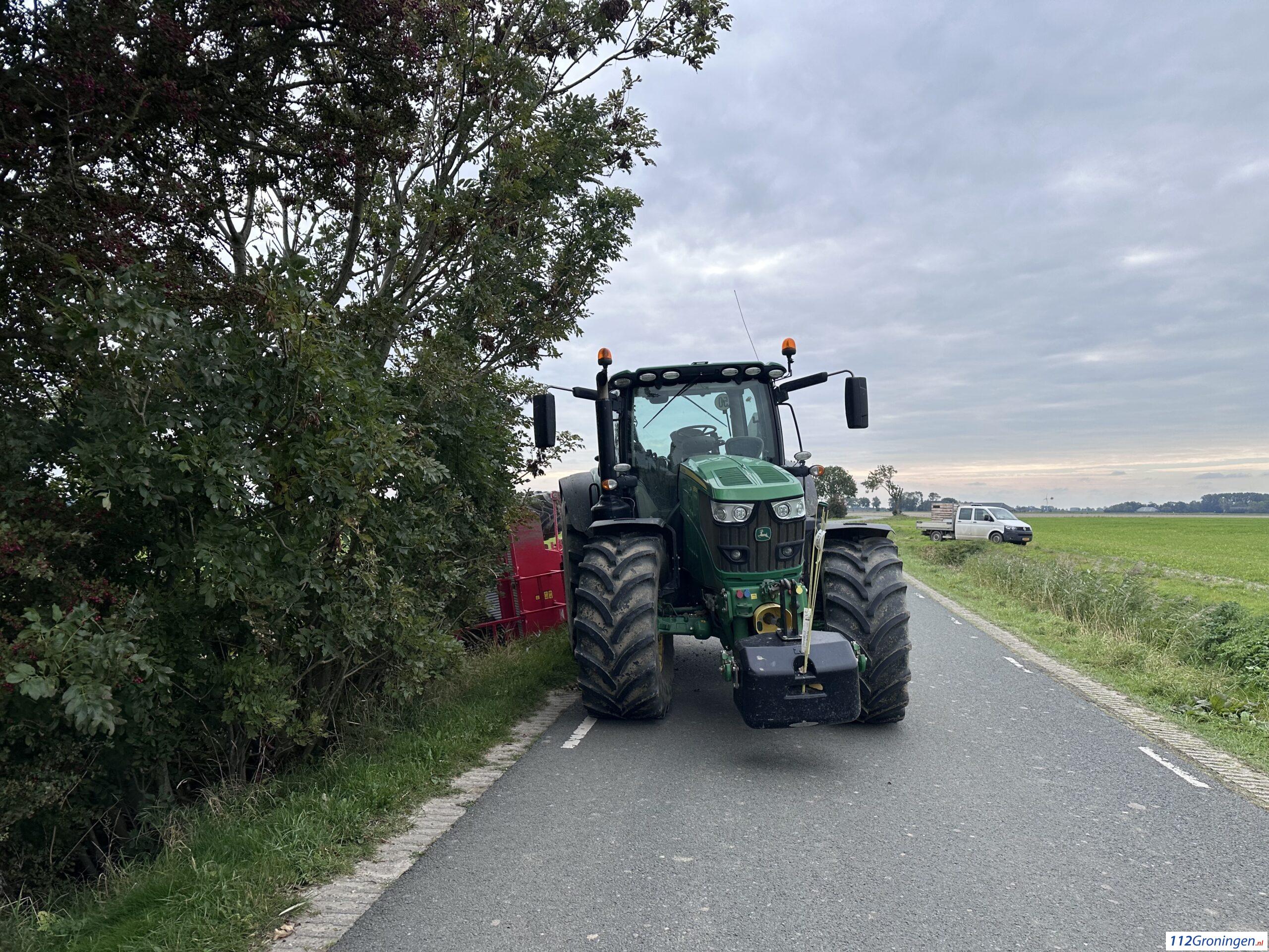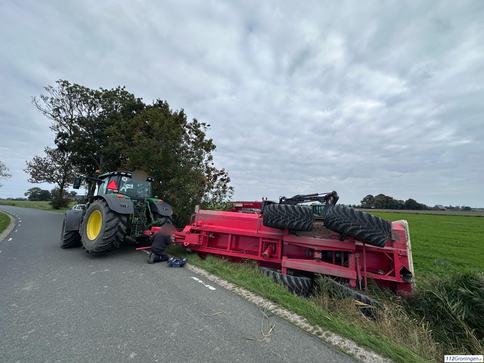 Stedum – Aan de Delleweg in Stedum is zaterdag een kieper vol aardappelen door nog onbekende oorzaak op de zijkant in een sloot beland.