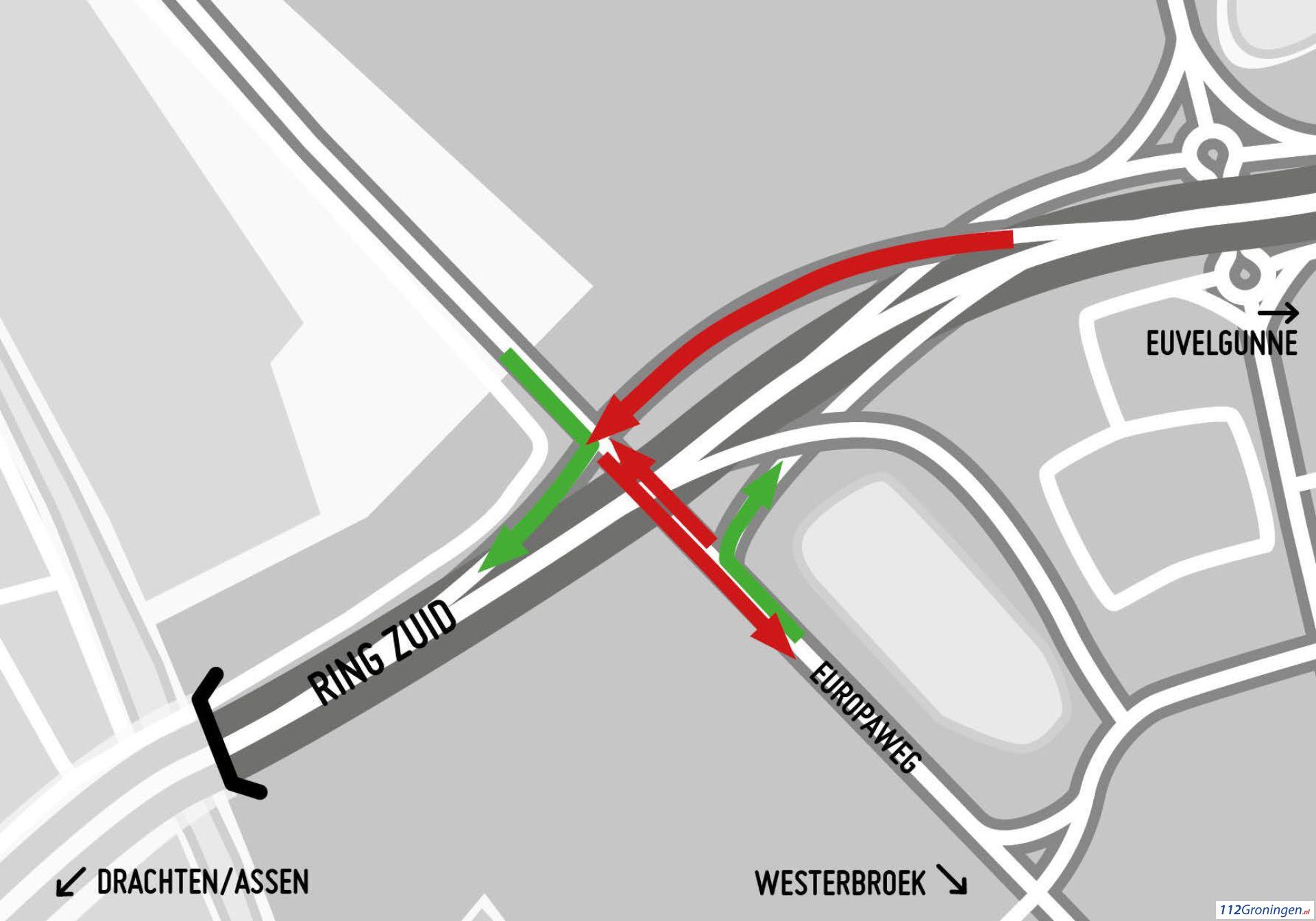 Verkeer vanuit het centrum kan nog wel de toerit gebruiken richting het Julianaplein. De verbinding onder het viaduct door, richting Westerbroek, is dicht. Ook de toerit richting knooppunt Euvelgunne is niet bereikbaar. Richting het centrum blijft de Europaweg wel open.