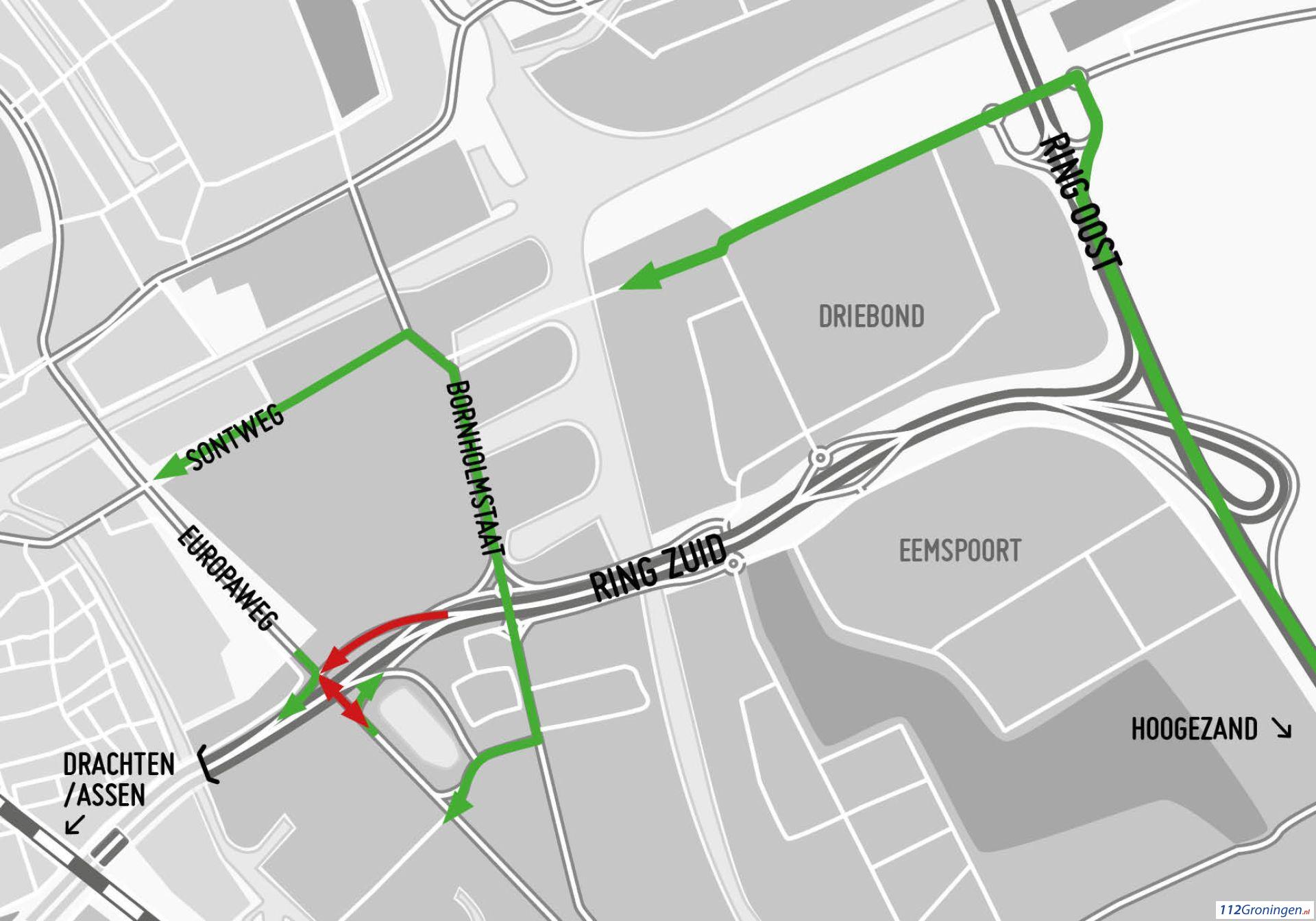 Verkeer vanaf de Griffeweg of Europaweg naar het zuiden wordt omgeleid via de Sontweg en Bornholmstraat. Vanaf de A7 (Hoogezand) naar het UMCG of het centrum kan worden omgereden via de oostelijke ringweg (N46) en afrit Meerstad. Daarna gaat de route via de Sint Petersburgweg en de Sontweg verder de stad in.