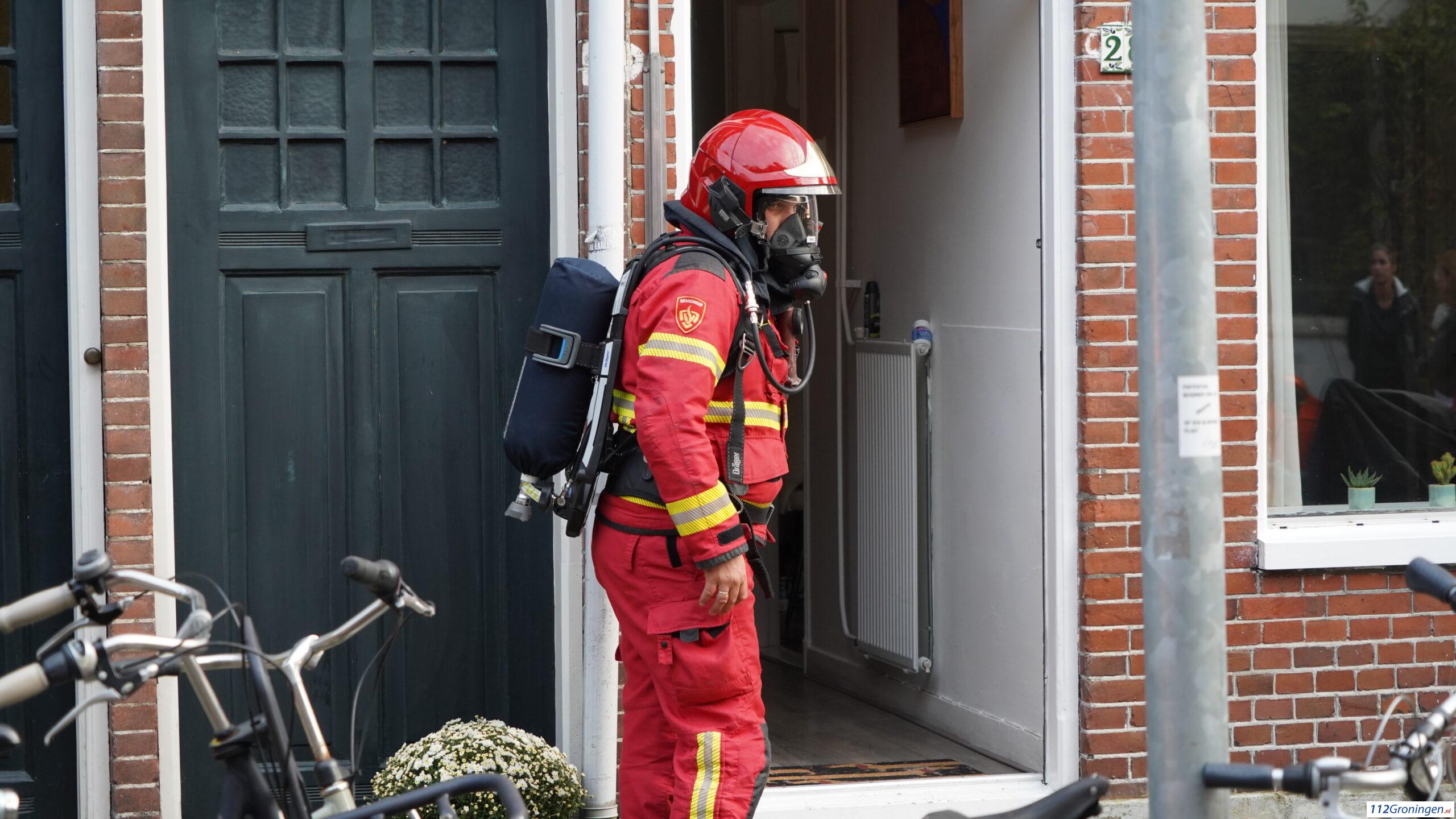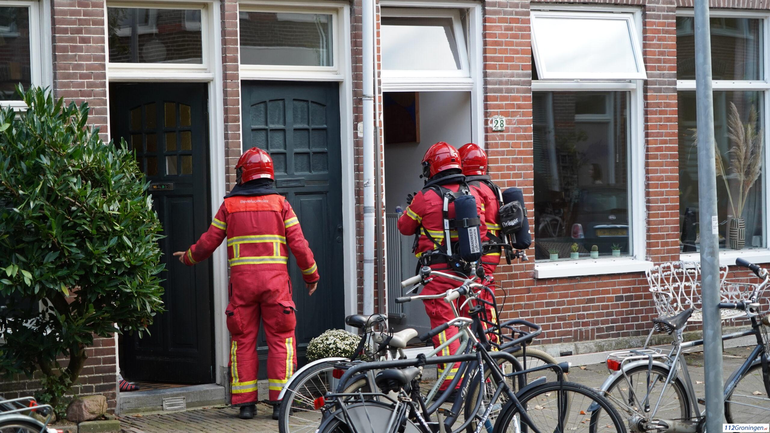 De brandweer doet onderzoek in de woning. Buurtbewoners roken gas en sloegen alarm. Velen kwamen een kijkje nemen, maar worden op afstand gehouden.