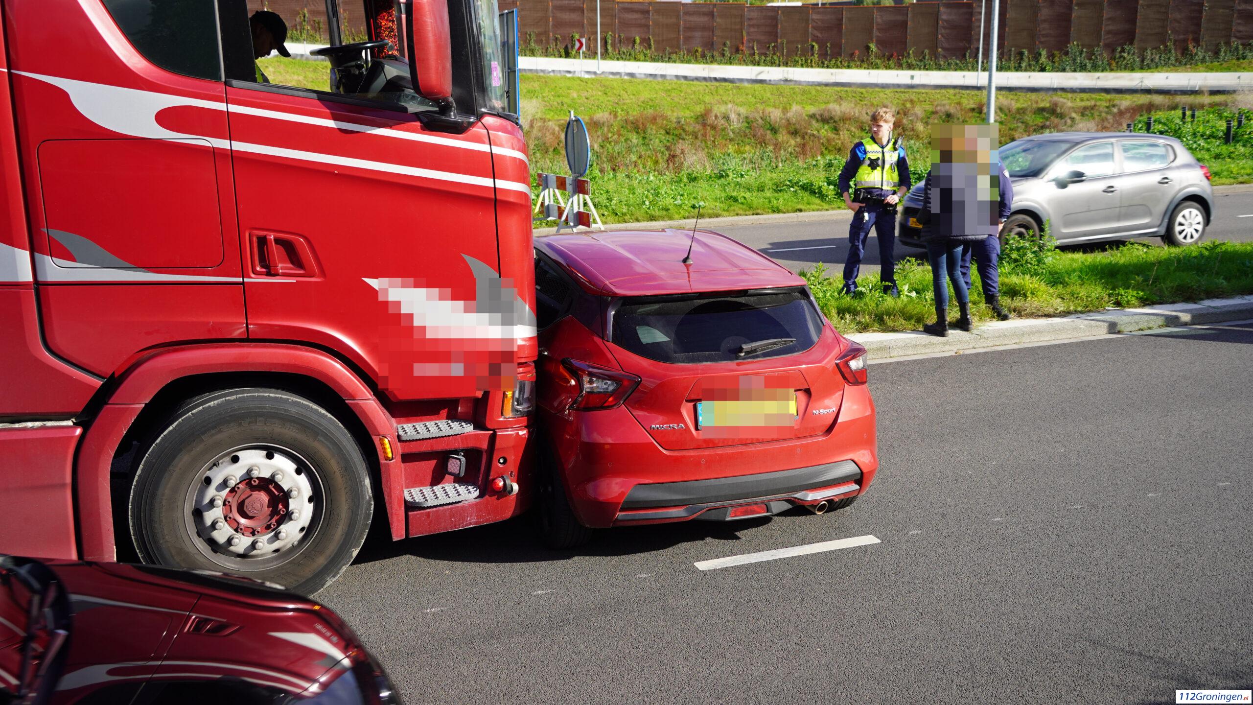 Hierbij is de auto voor de vrachtwagen gekomen en 90 graden gedraaid. Hulpdiensten zijn ter plaatse. De weg was deels gestremd wat zorgt voor hinder. Niemand raakte gewond.