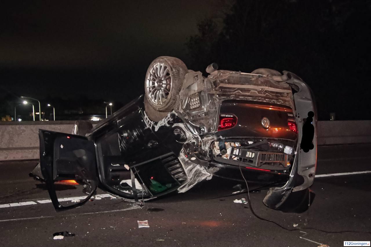 Volgens de politie raakte een personenauto door nog onbekende oorzaak een geleiderail, waarna het voertuig over de kop sloeg. Kort daarna botsten een personenauto en een busje op elkaar.