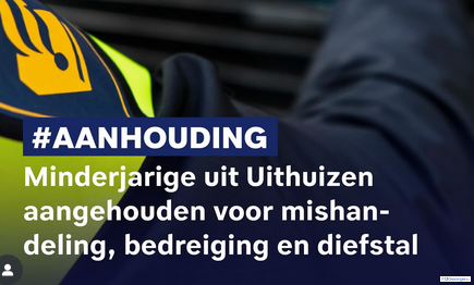 Op woensdag 10 september kreeg de politie rond 17:15 uur melding van een mishandeling, bedreiging en diefstal aan de Sportlaan in Uithuizen. De verdachte mishandelde één van de slachtoffers. Kort daarna bedreigde hij het andere slachtoffer, waarbij hij mogelijk een mes gebruikte. Van dit slachtoffer stal hij vervolgens de fatbike. Hier werd eerder over bericht op deze site.