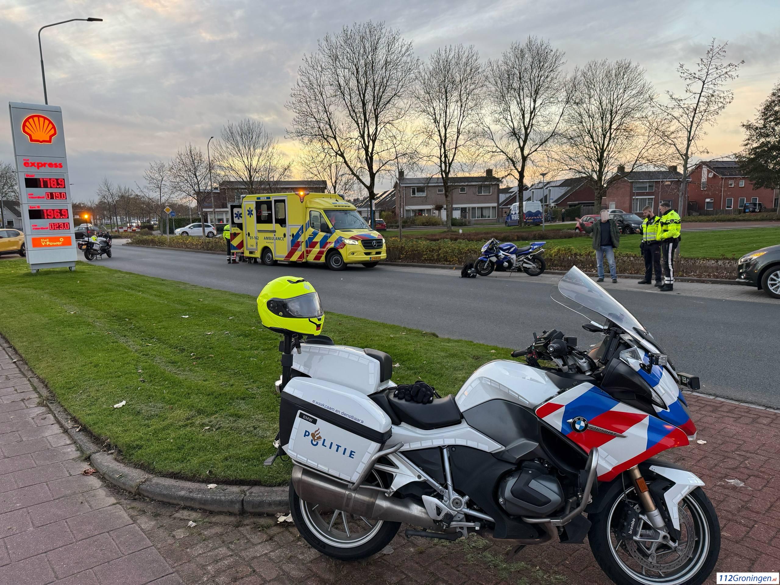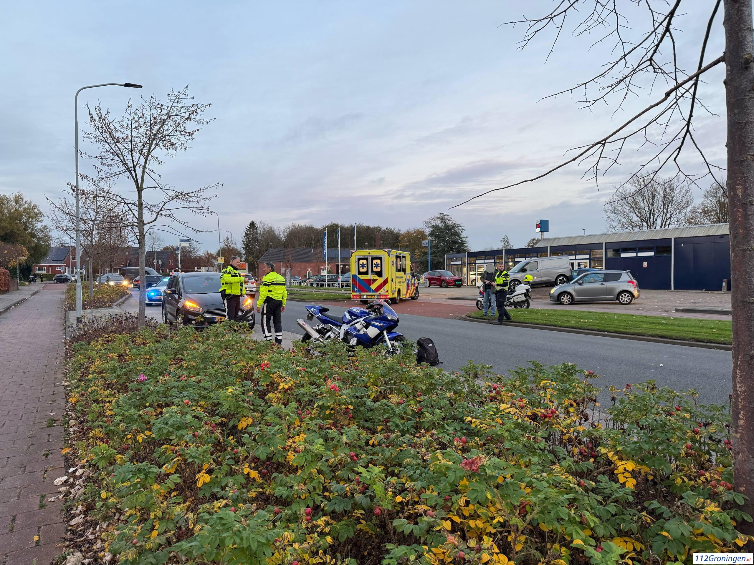 De motorrijder is na de botsing hard ten val gekomen en met brancard in de ambulance gelegd voor behandeling van zijn onbekende verwondingen.
