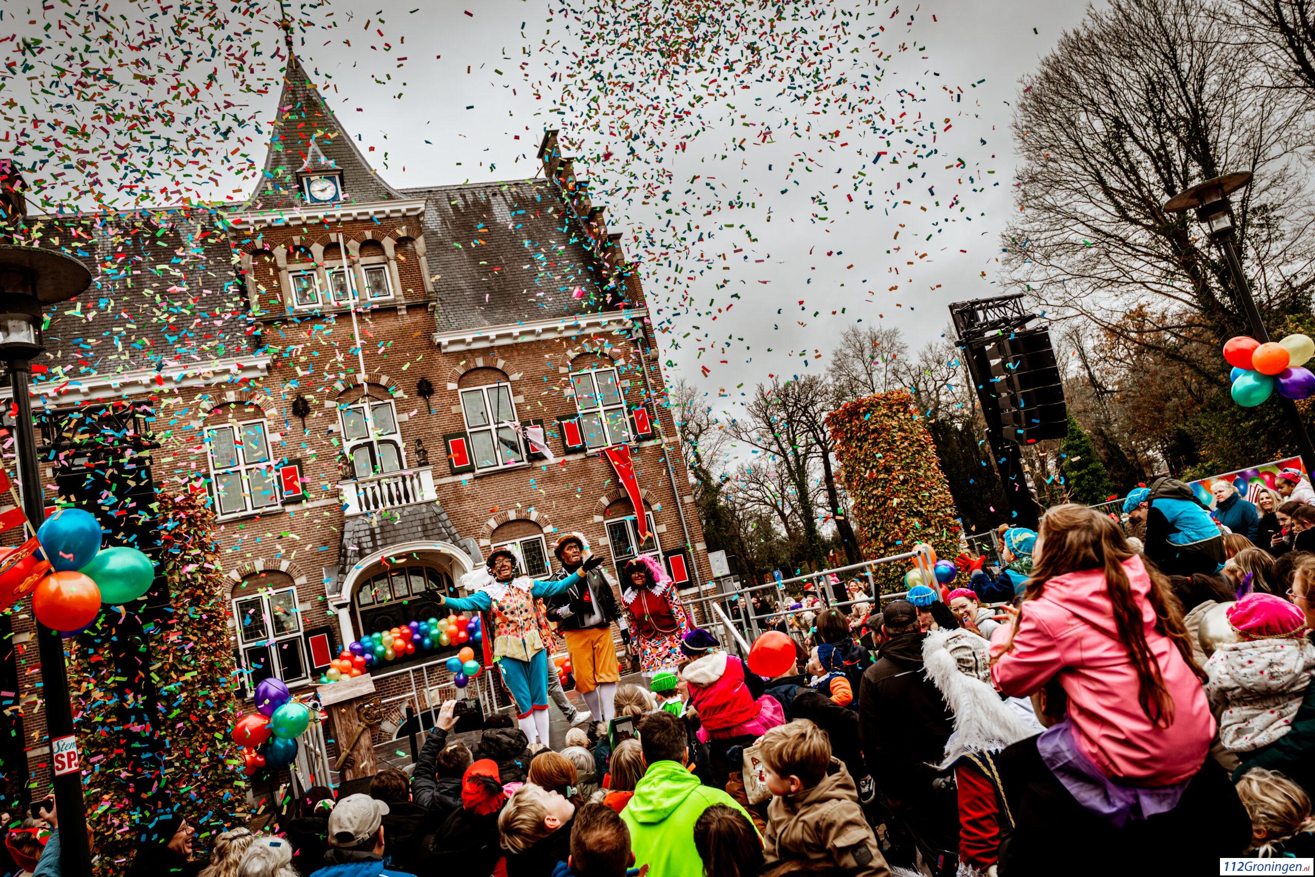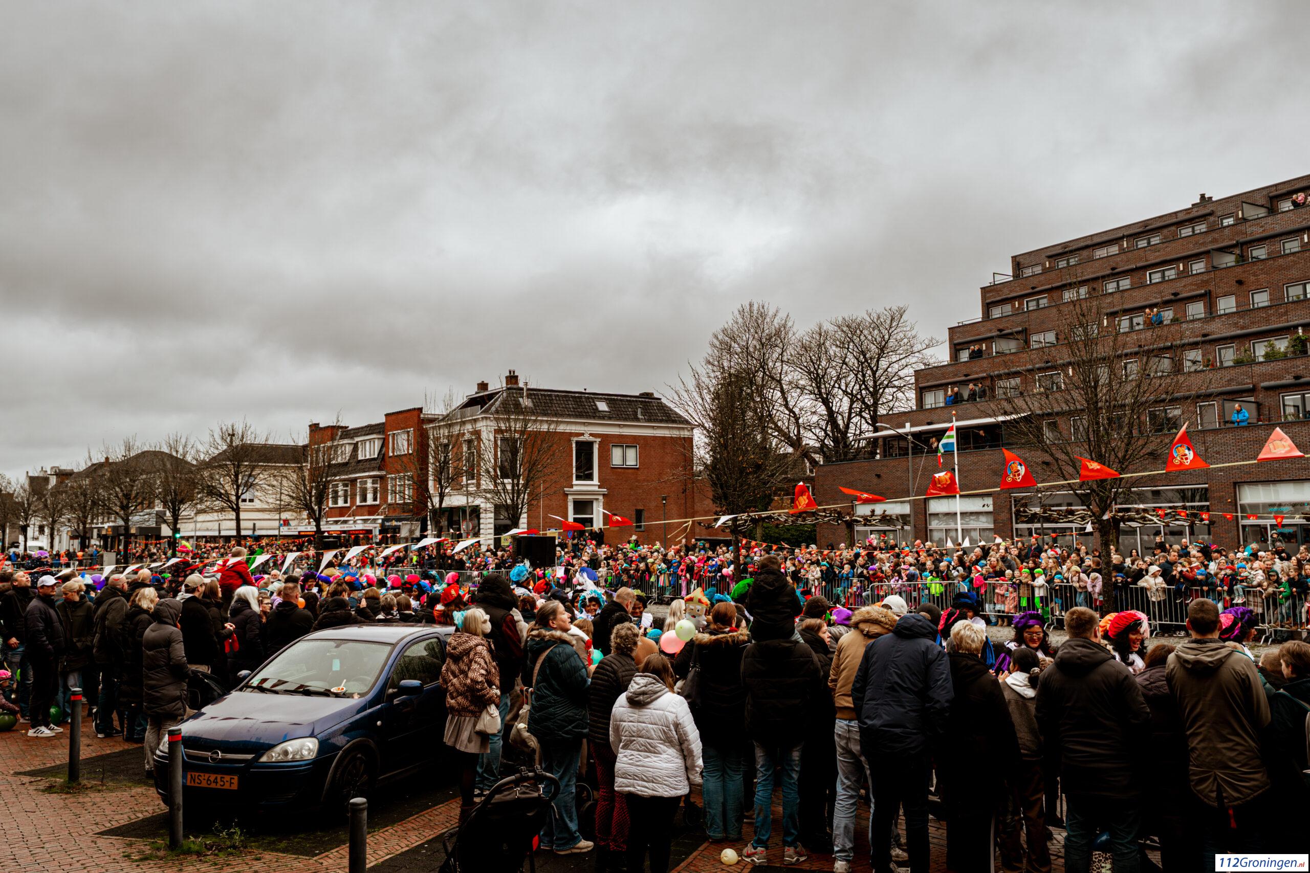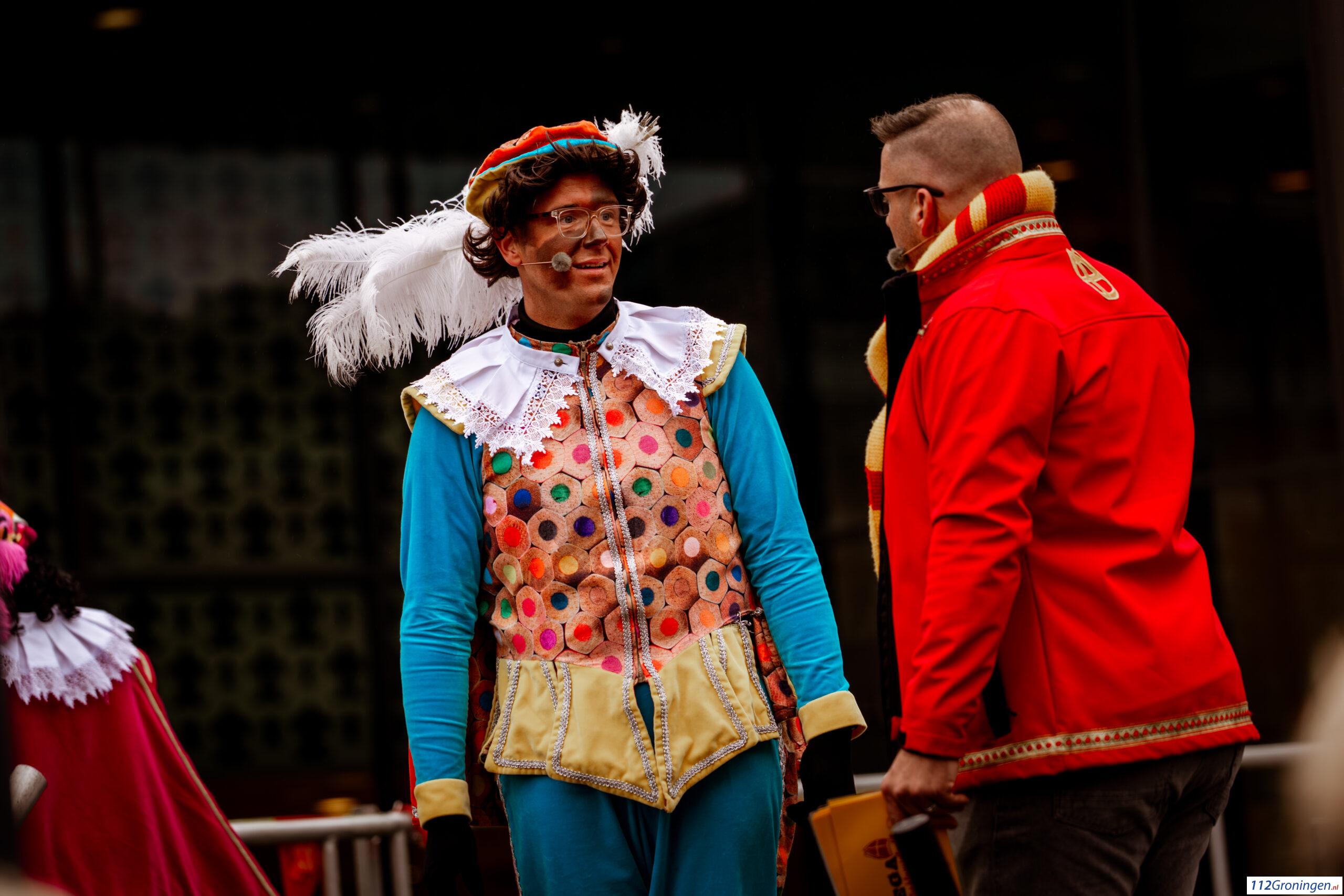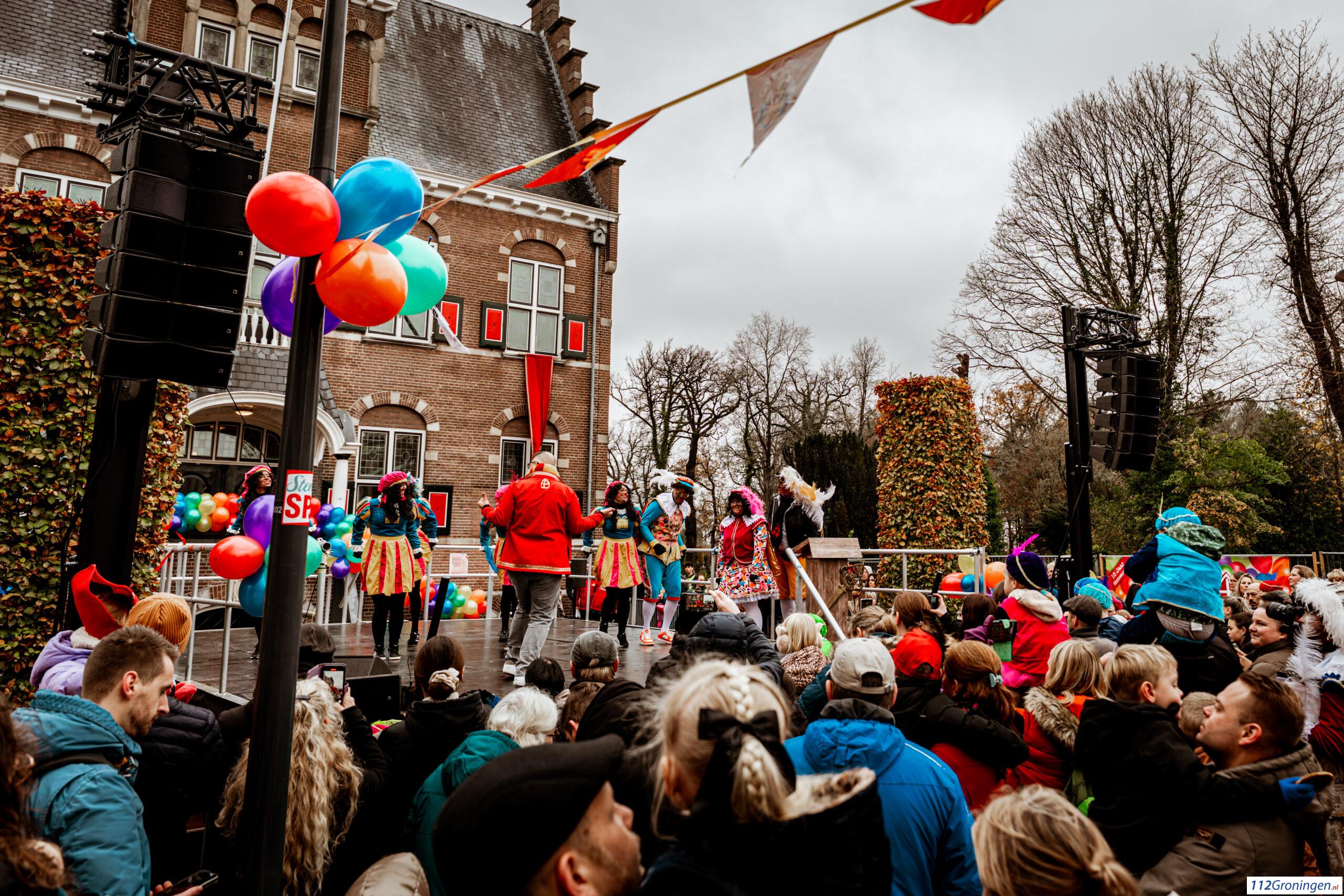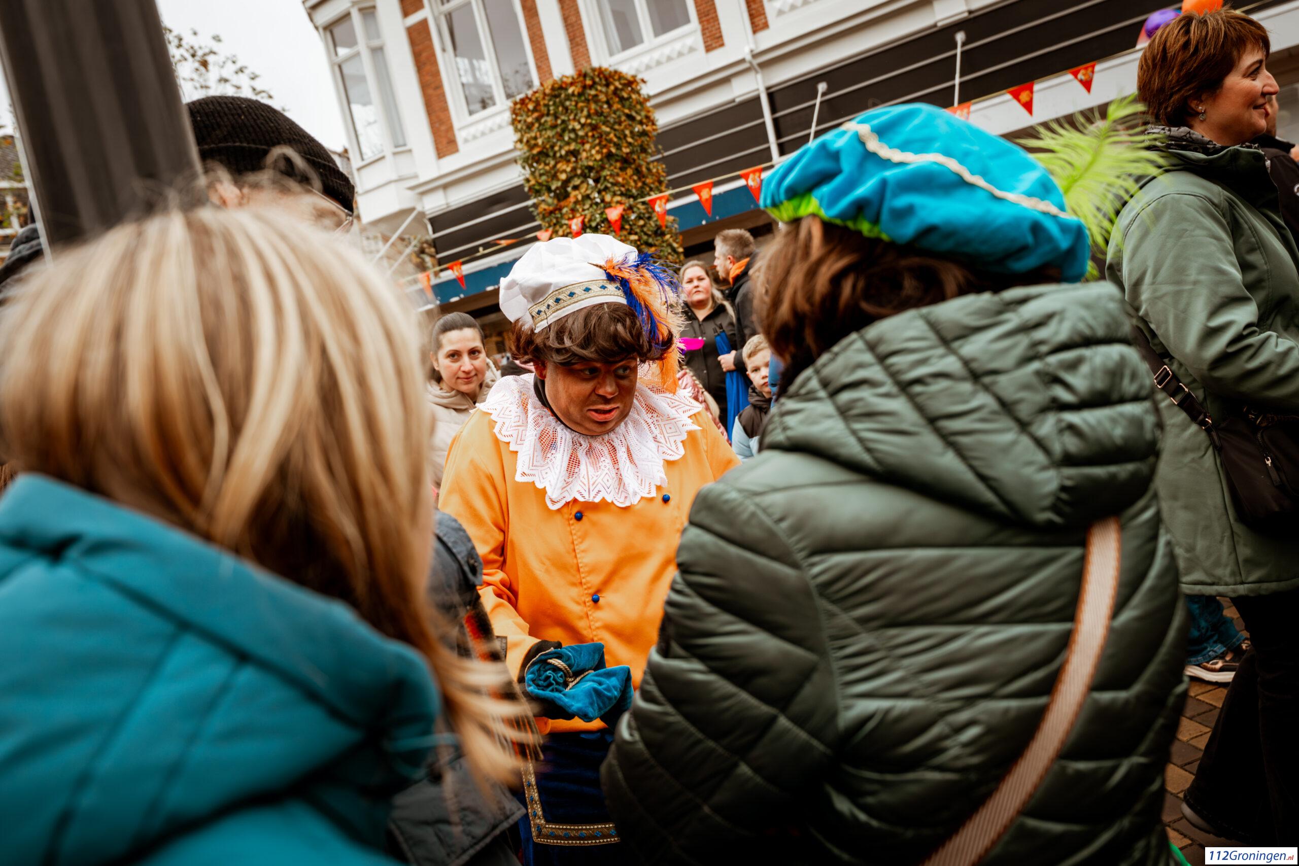 Na de aankomst trok een vrolijke stoet – met muziek, pieten en kinderen die enthousiast meeliepen – door het centrum van Veendam. Het eindpunt was het gemeentehuis, waar een groot podium was opgebouwd.