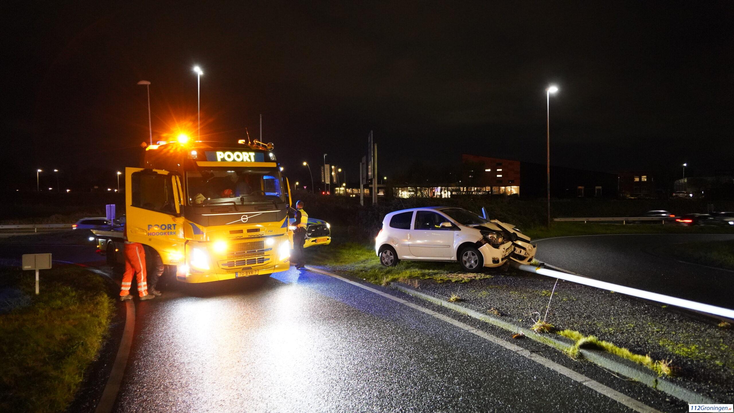 De toedracht is onbekend. De schade is groot. De afrit was tijdelijk afgesloten als je vanuit Hoogezand kwam. Niemand raakte gewond. Berger Poort ging de auto afslepen.