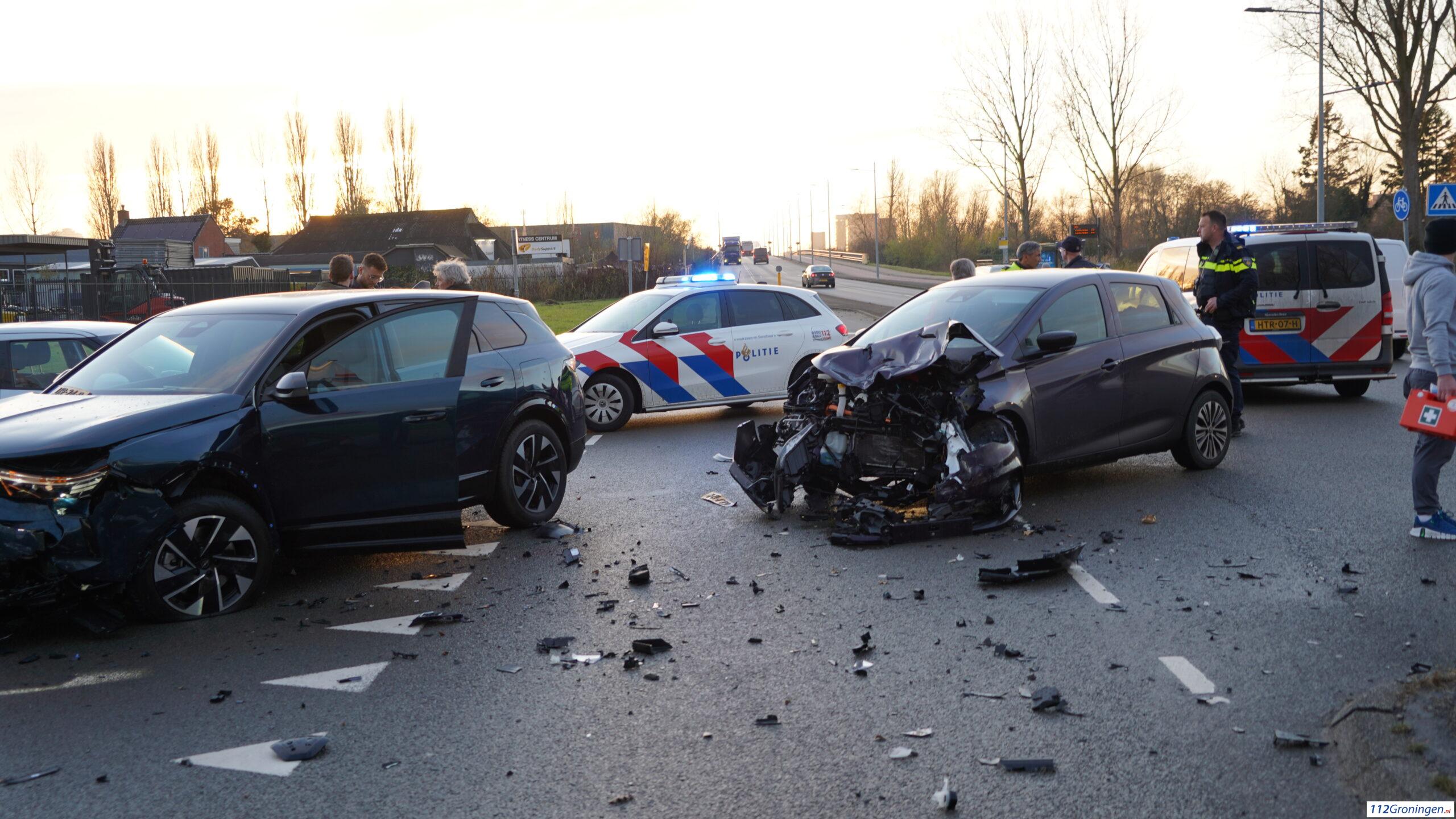 Groningen- Op de kruising Sint Petersburgweg/ Stettinweg heeft woensdagmiddag een forse aanrijding plaatsgevonden tussen twee auto’s. De schade was groot.
