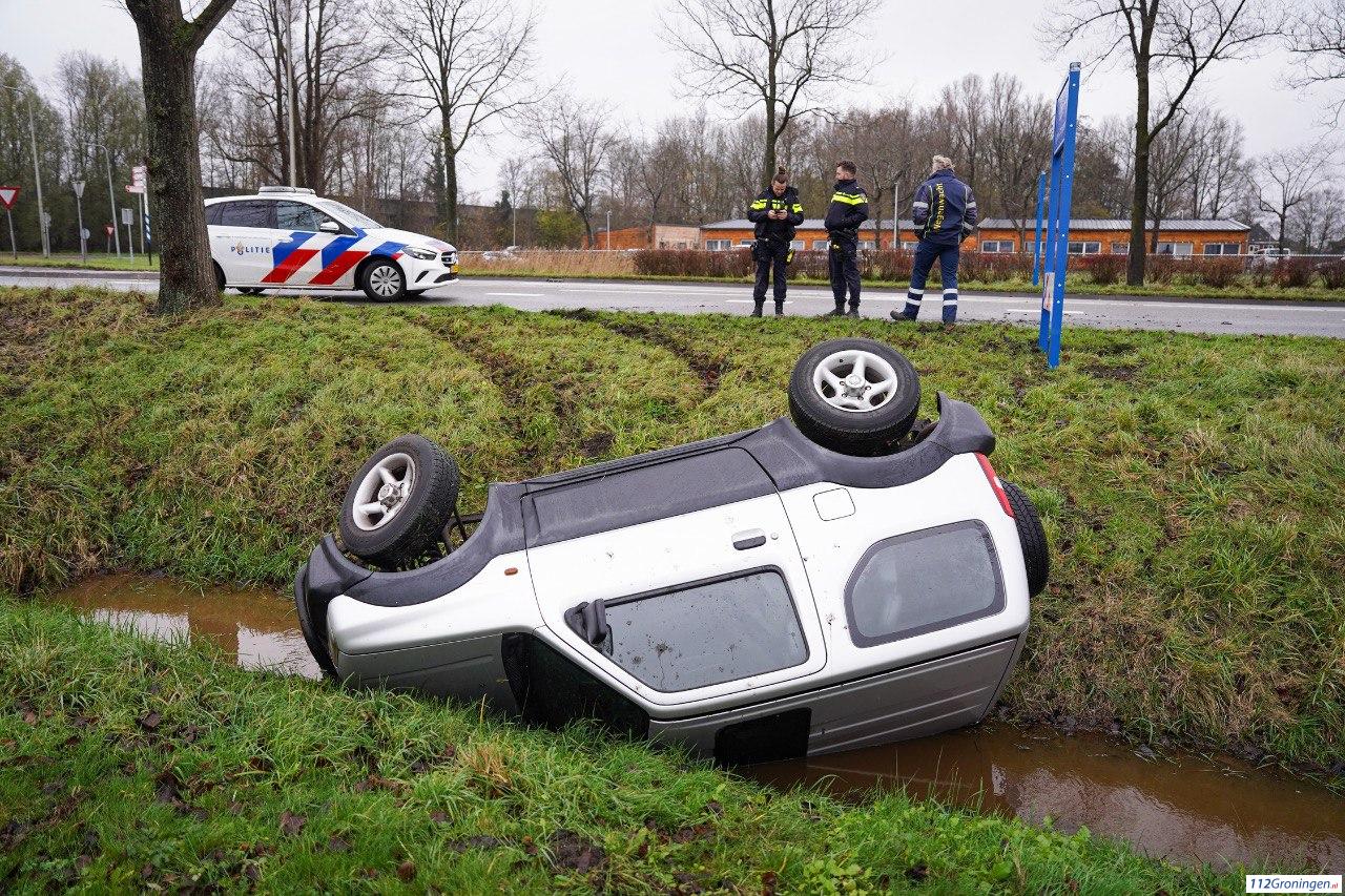 Haren – Langs de Emmalaan in Haren is zaterdagochtend een auto van de weg geraakt en op de zijkant in een sloot beland.