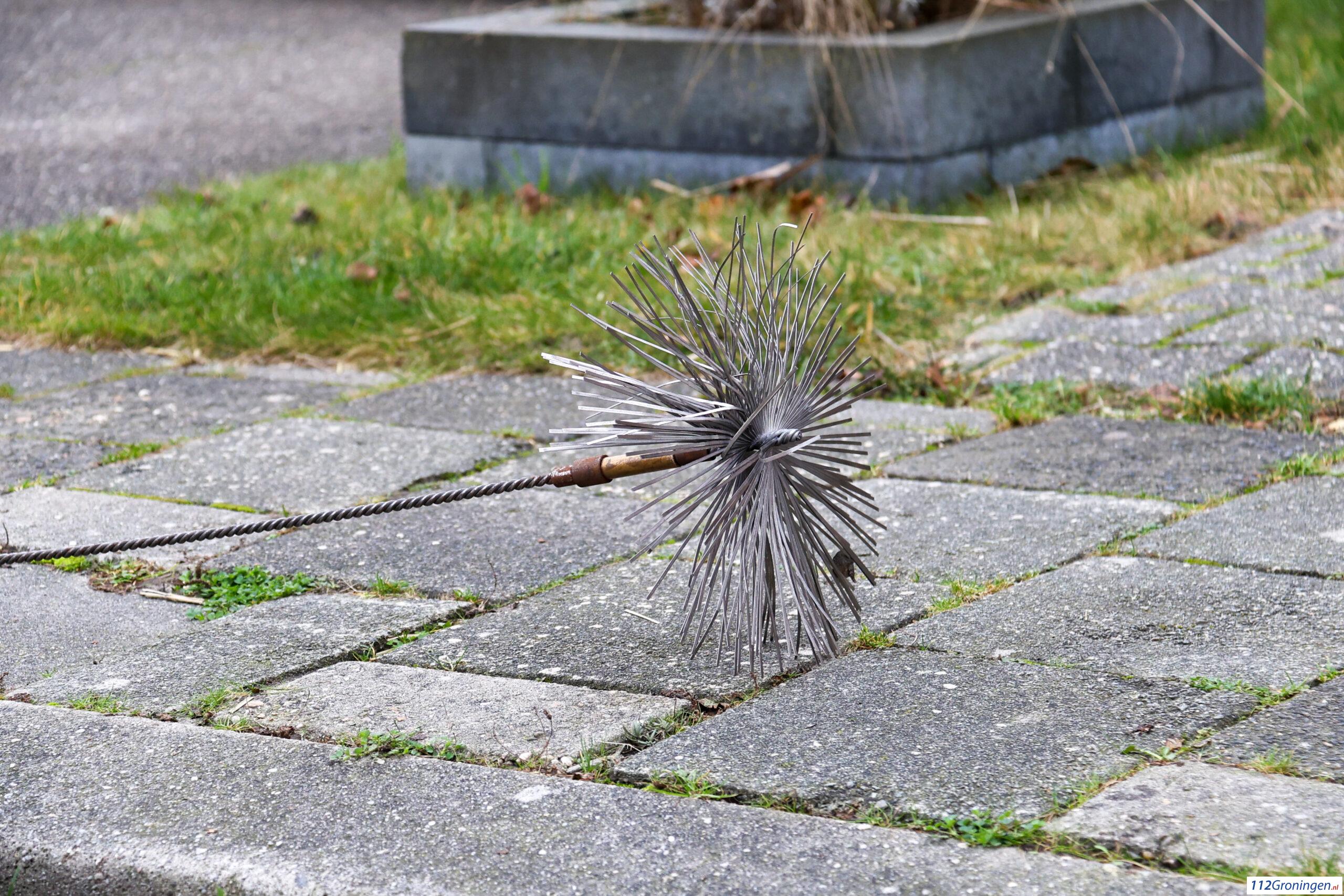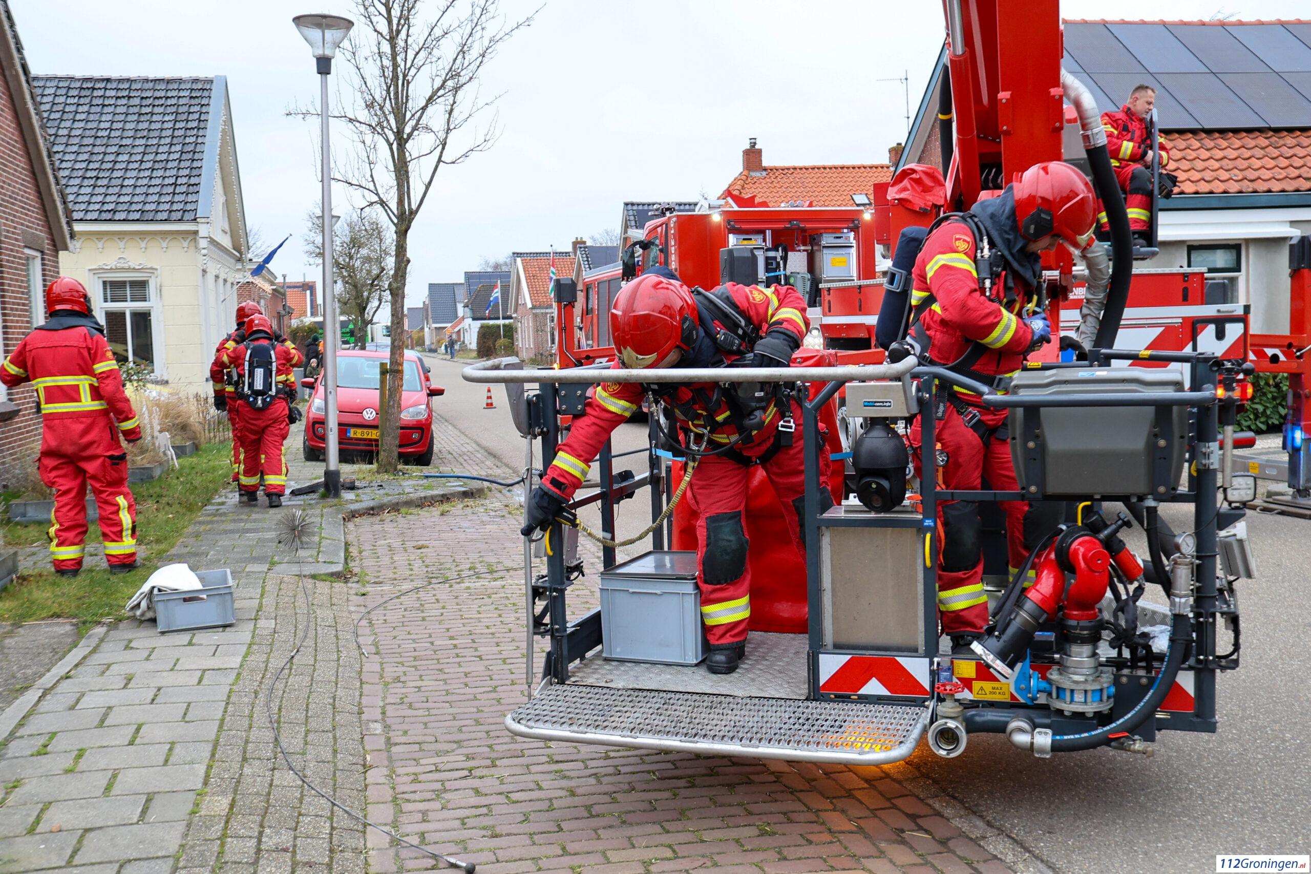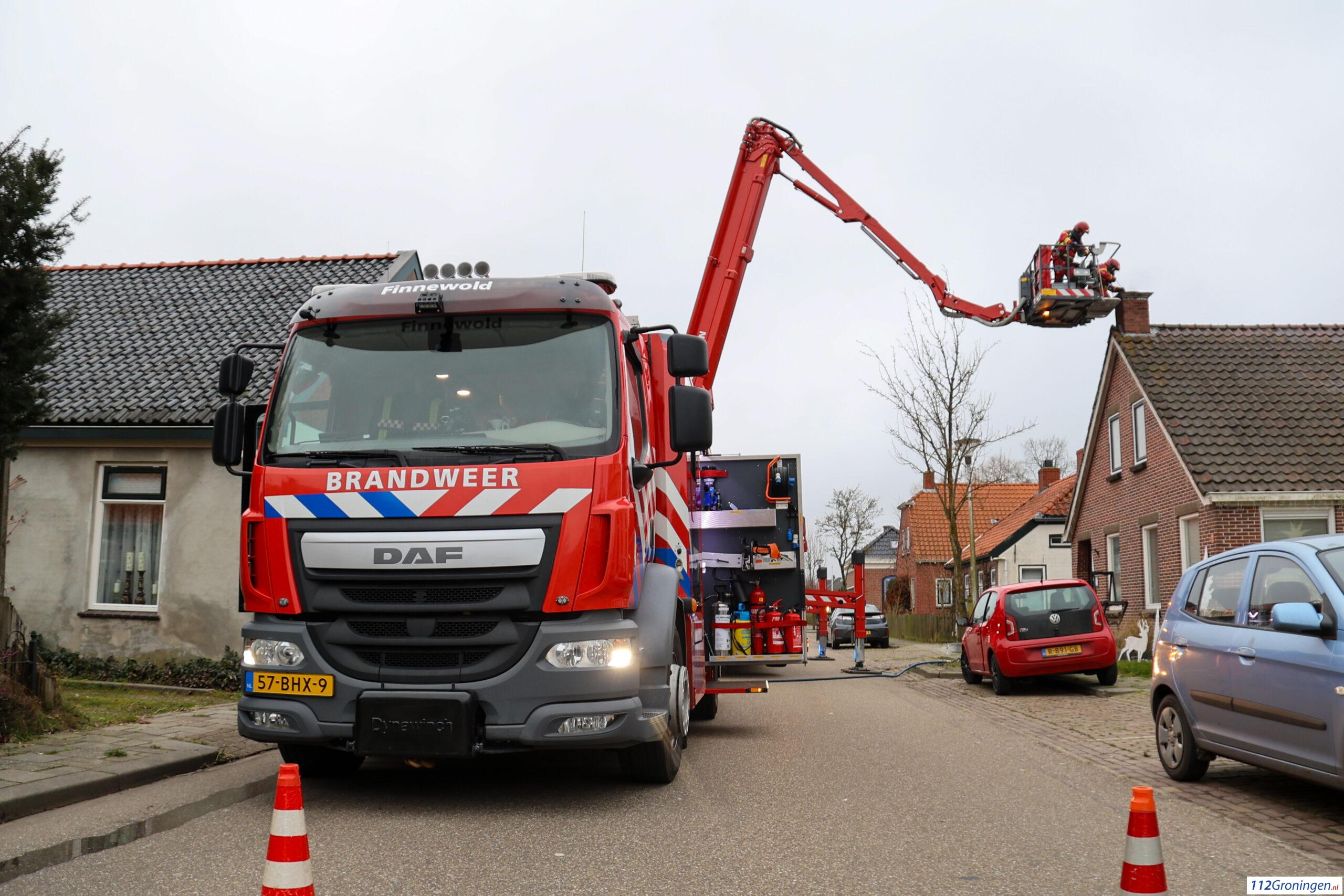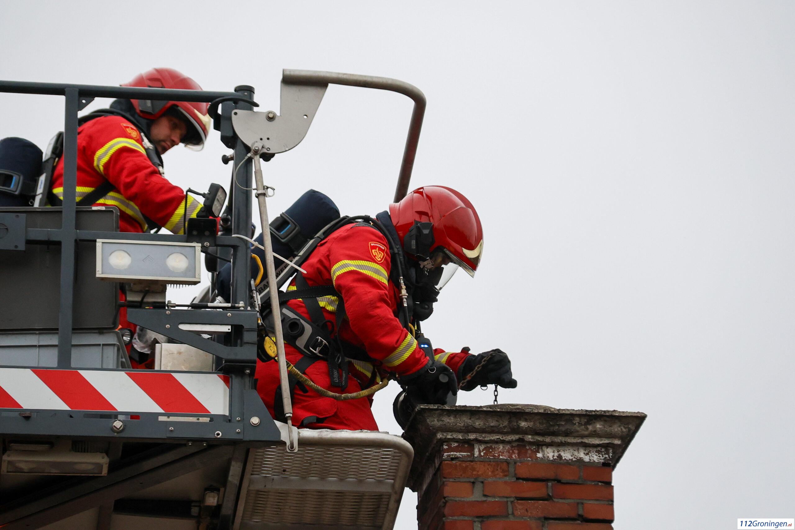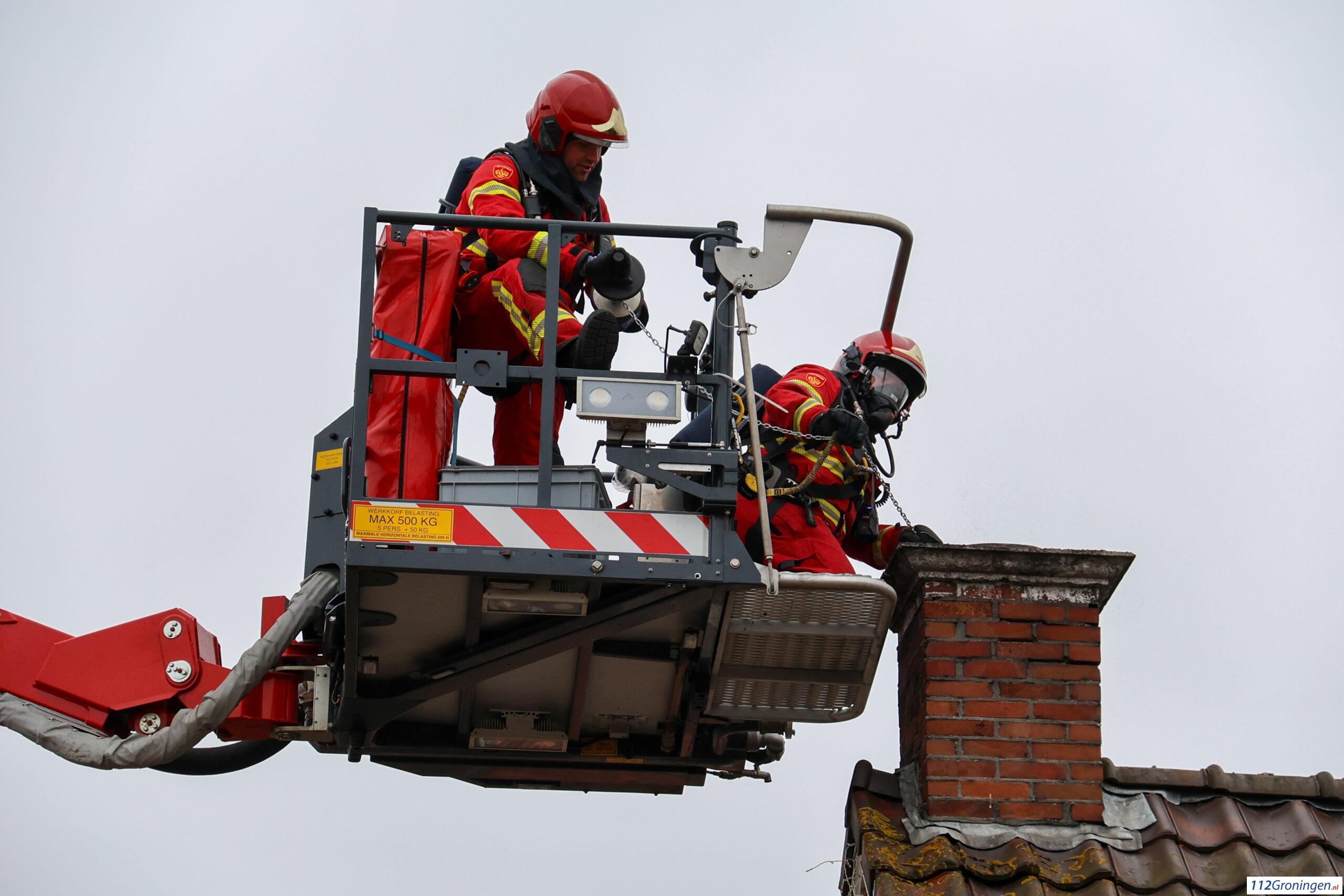 Met de hoogwerker wordt de schoorsteen geveegd. De brandweer is binnen in de woning nog delen aan het slopen. Salvage is opgeroepen om de bewoners te helpen met de schade.