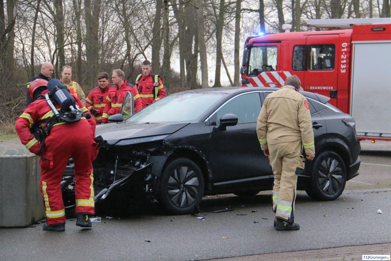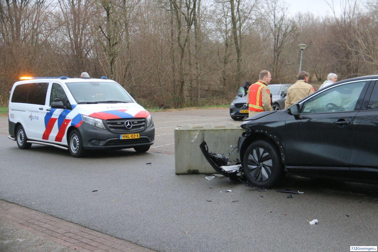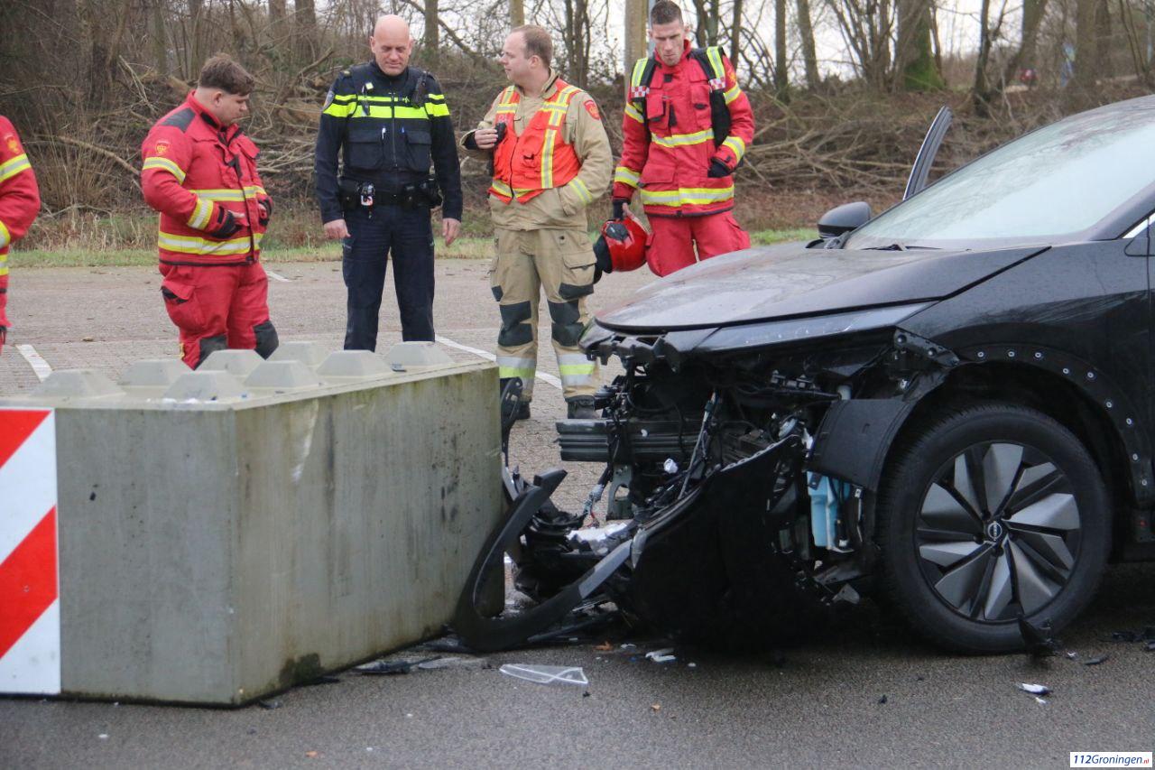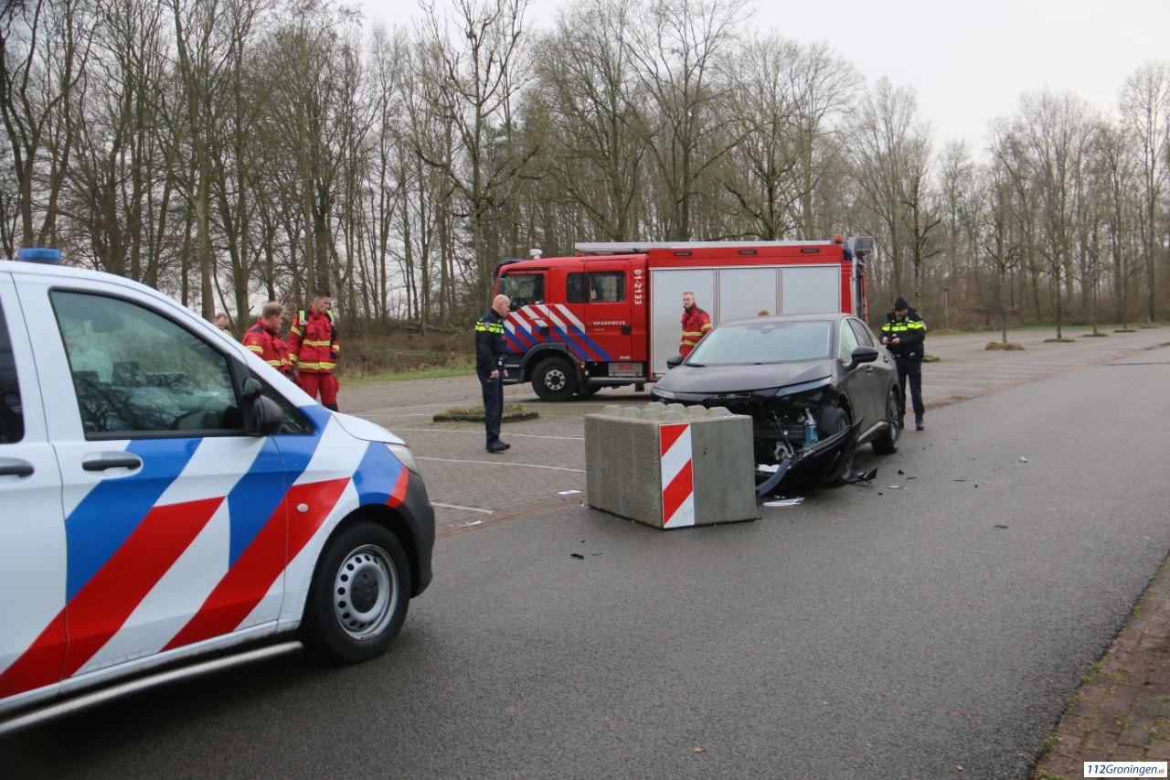 Kropswolde – Maandagmiddag is een auto op de Strandweg in Kropswolde tegen een betonblok gebotst. Door de klap kwam er rook uit het voertuig.