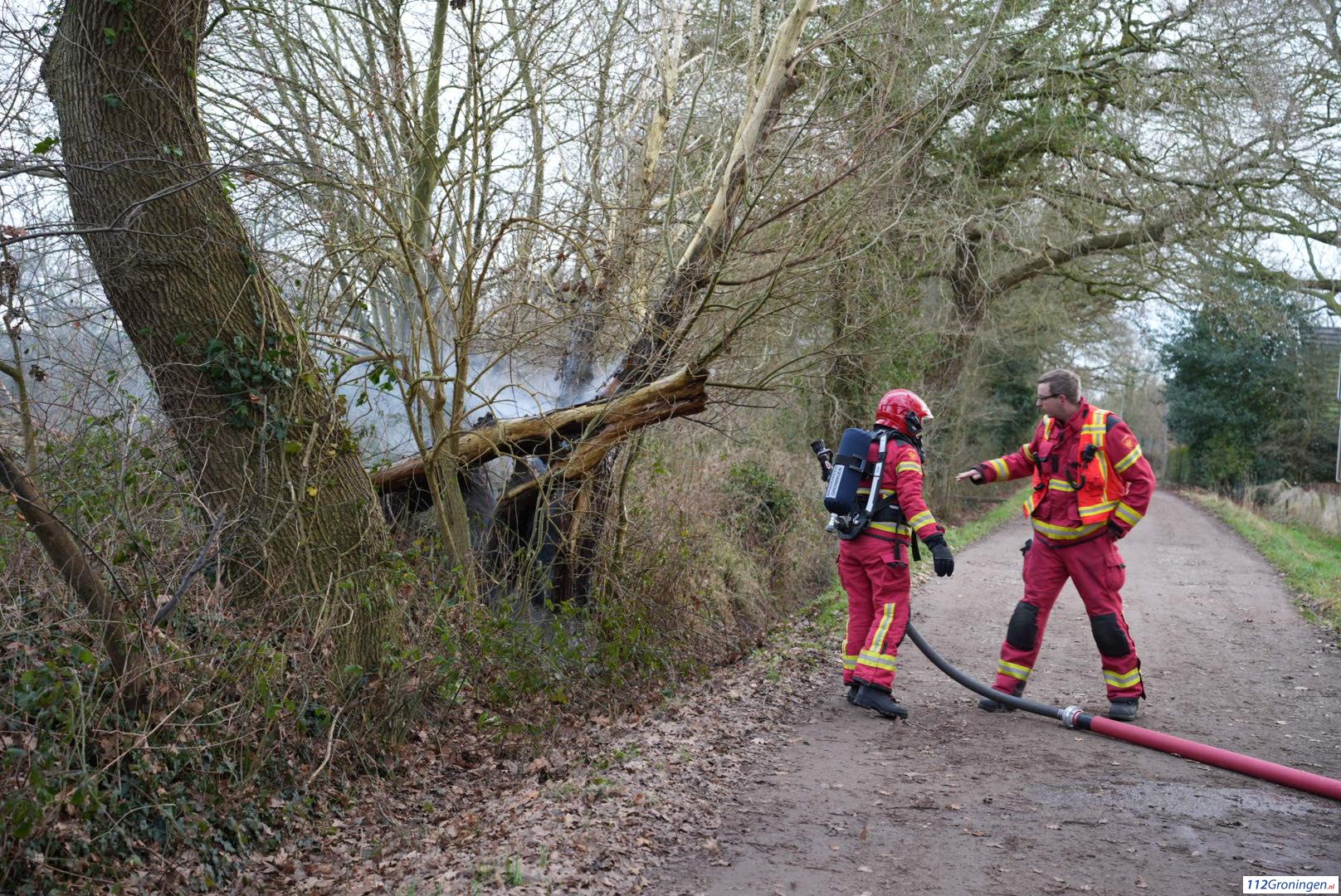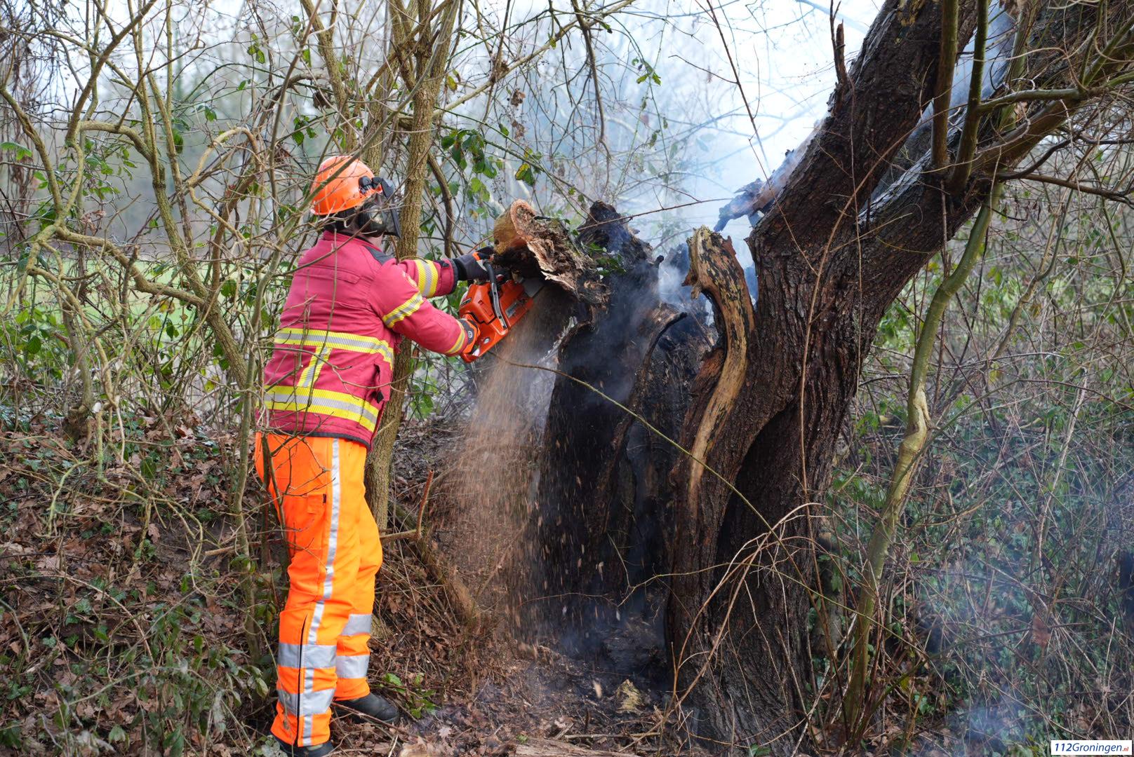 De brandweer heeft de brand snel geblust en de boom met een kettingzaag opengezaagd om te controleren of er geen smeulende resten achterbleven.