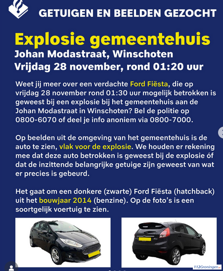Heb je meer informatie over deze auto? Woon je in de omgeving en heb je toch nog beelden, waarop deze auto te zien is? Of heb je andere informatie over personen, die mogelijk betrokken zijn geweest bij de explosie, al dan niet in combinatie met de Ford Fiësta? Neem dan contact op met de politie via 0800-6070. Anoniem je informatie delen kan via 0800-7000.