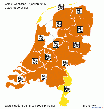 Code oranje geldt in het hele land, met uitzondering van Limburg en de Wadden. Daar blijft code geel van kracht voor gladheid.
