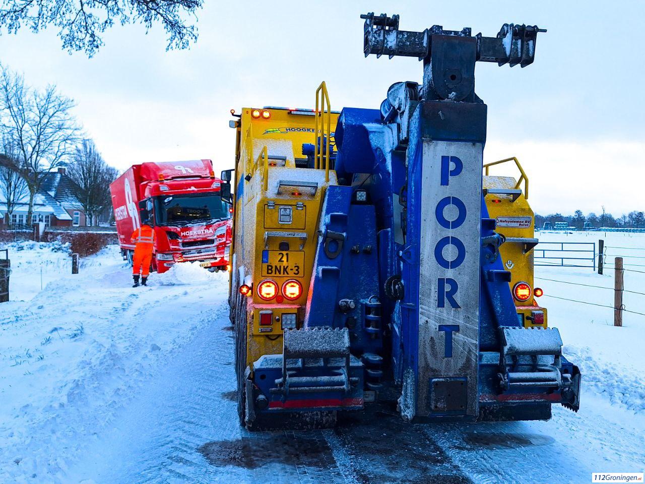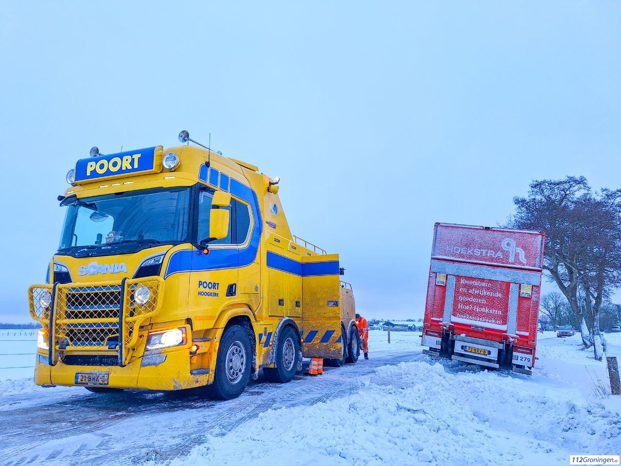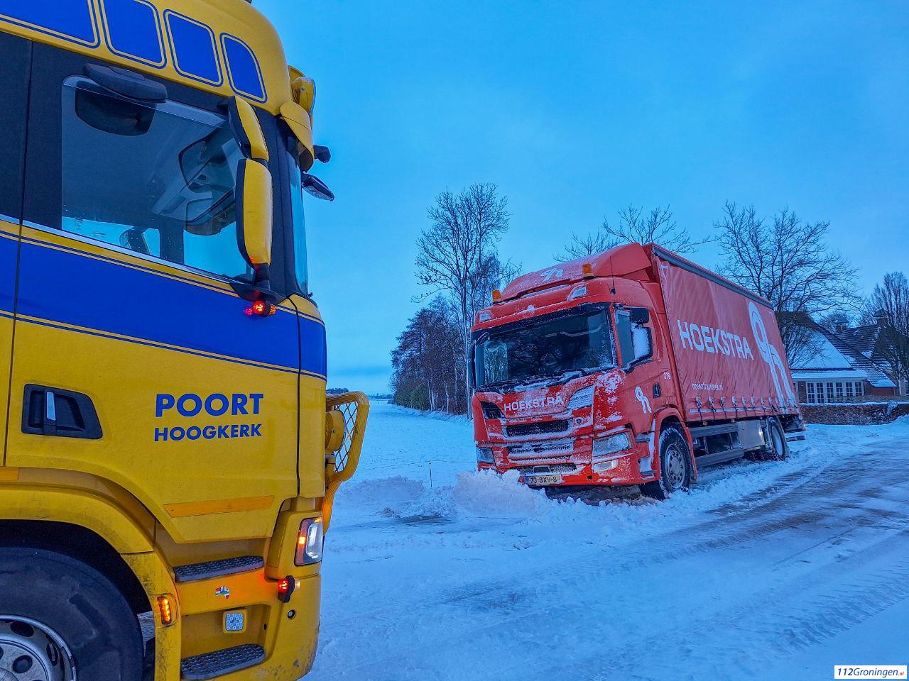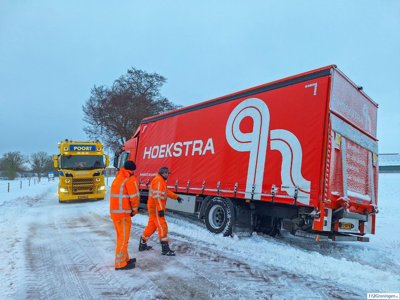 Lettelbert – Woensdagmiddag rond 13.30u is een vrachtwagen aan de Hoofdstraat in Lettelbert in de berm beland. De chauffeur is met de schrik vrij gekomen. Door de enorme drukte bij het bergingsbedrijf i.v.m. de gladheid kon berger Poort uit Hoogkerk pas om 16.00 u beginnen met de berging.