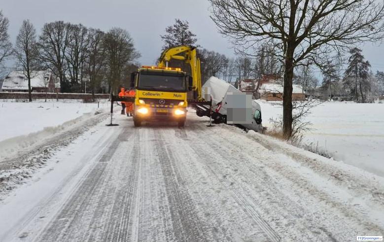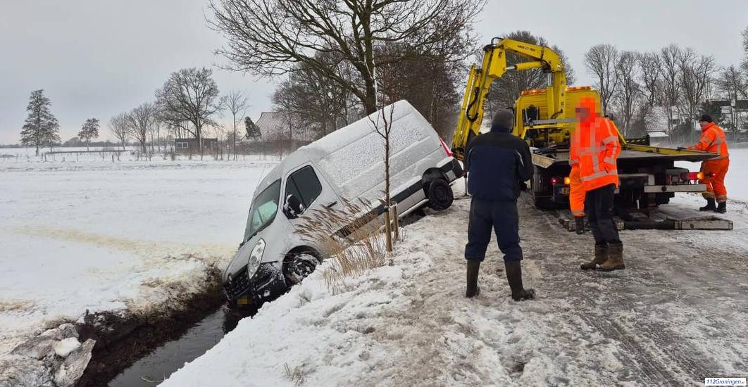 Winter, storm Goretti: Auto raakt van de weg door de gladheid bij Tolbert & Eelwerderbrug in storing