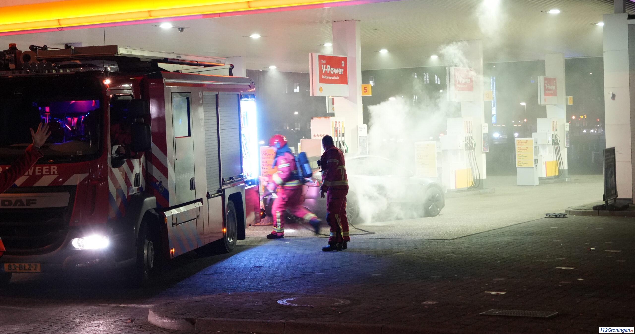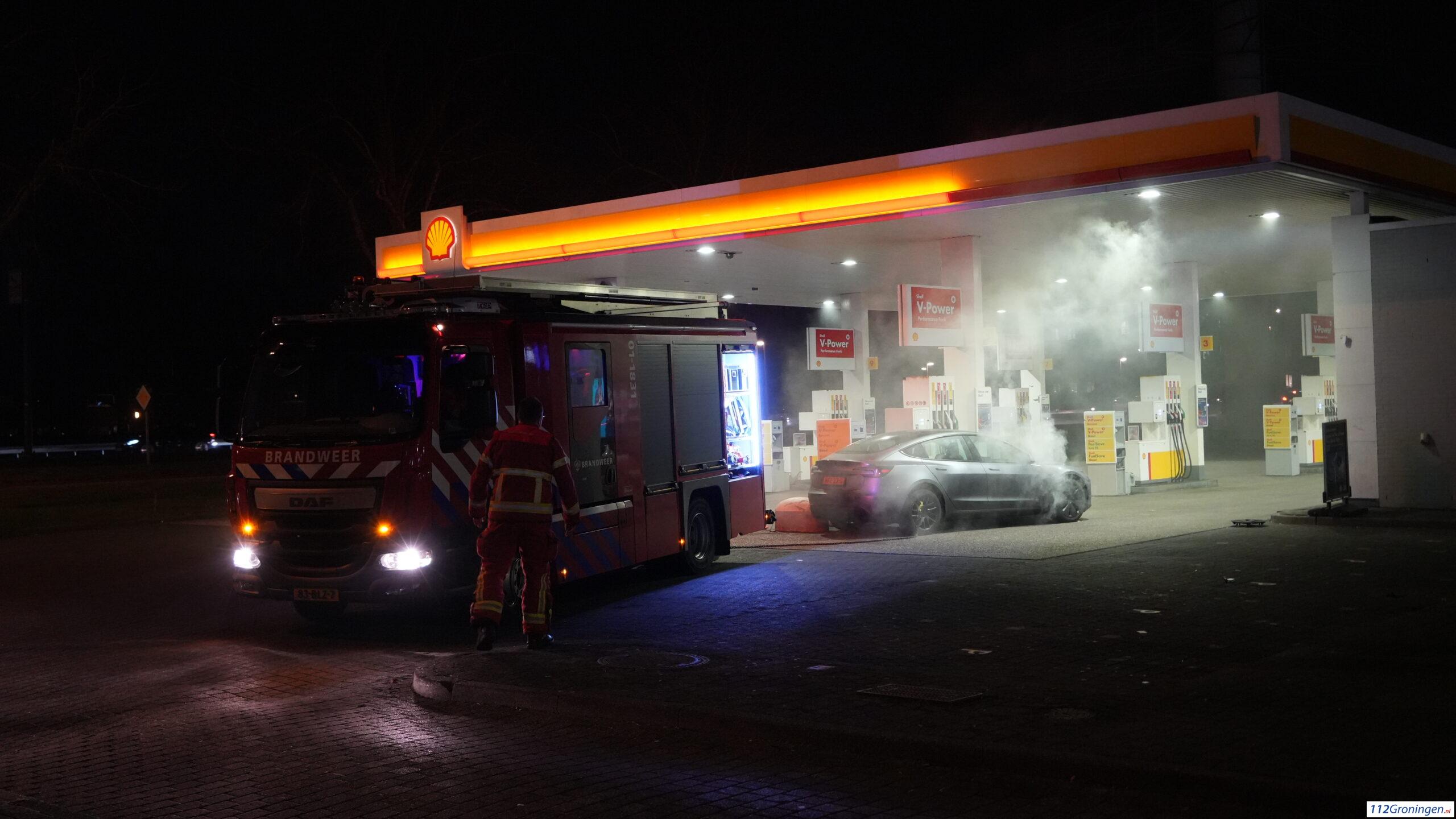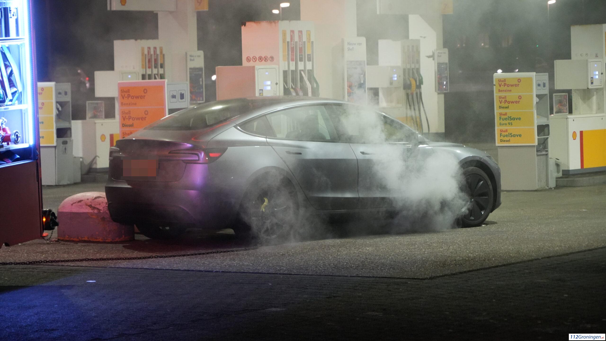 De brandweer heeft de Tesla van het tankstation weggehaald en geblust. De oorzaak is onbekend.