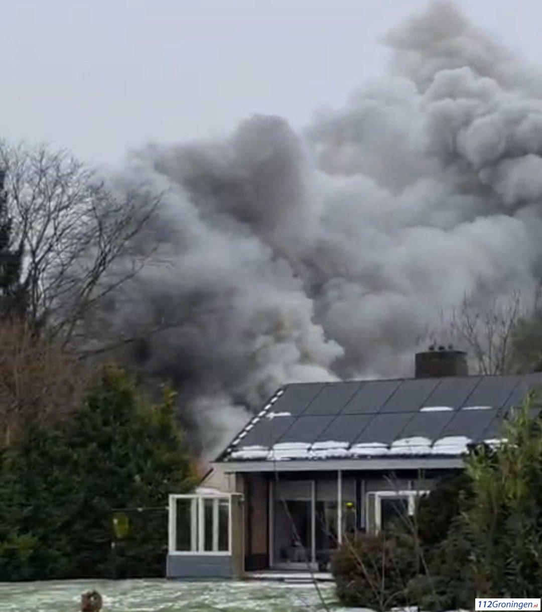 De brand in de woning is op de benedenverdieping uitslaand en ontwikkeld zich naar de bovenverdieping. De brandweer probeert dat te voorkomen. Dit doen ze om de woning beneden te blussen. Updates via VR Groningen.