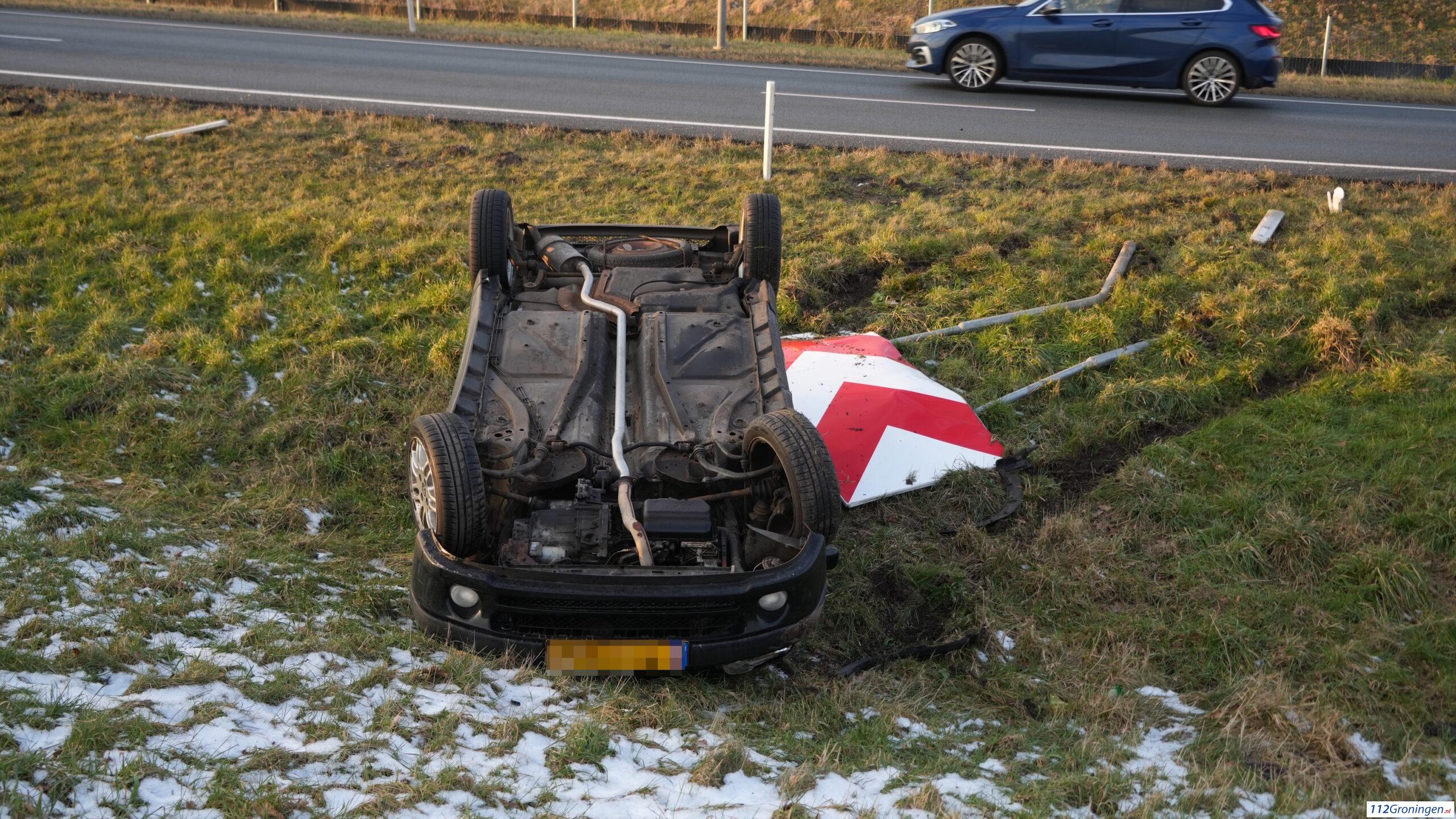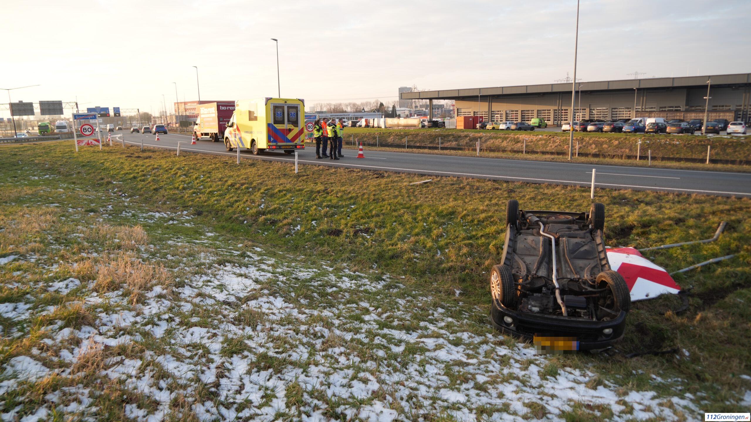 Groningen – Op de afrit van de N46 naar de N7 bij knooppunt Euvelgunne heeft maandagmiddag rond 16:35 uur een eenzijdig ongeval voorgedaan. Een auto is daarbij op de kop naast de weg terechtgekomen.