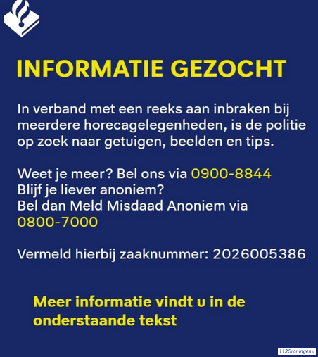 Groningen – In verband met diverse inbraken bij horeca gelegenheden in Groningen is de politie op zoek naar tips en beelden.