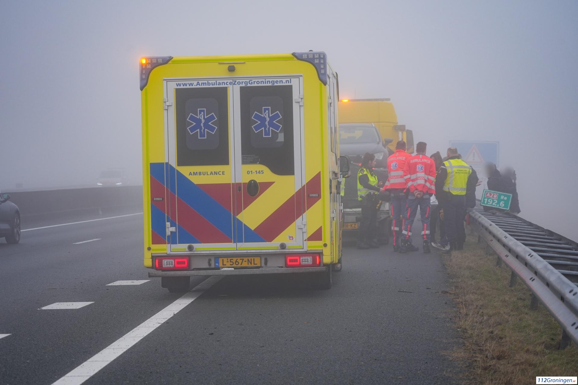 Haren – Op de snelweg A28 tussen Eelde en Haren heeft zaterdagochtend een kop-staart ongeluk plaatsgevonden tussen twee auto’s, waarvan één met aanhangwagen. Op de plek van het ongeluk was sprake van dichte mist.