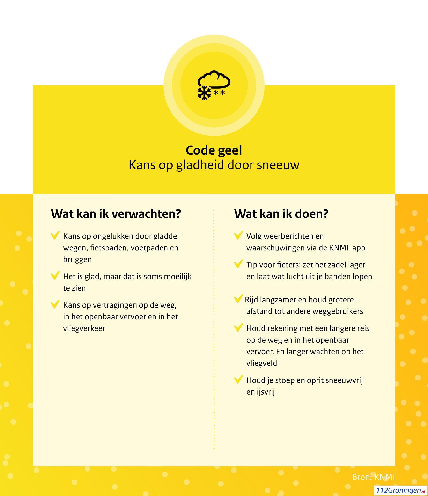 In de loop van de nacht naar maandag wordt het vanuit het zuidwesten langzaam droger of gaat de neerslag over in regen of natte sneeuw. “In het noordoosten kan de gladheid door sneeuw tot maandag in de vroege ochtend aanhouden.” Voor de provincie Groningen geldt code geel vooralsnog tot maandagochtend 10.00 uur.