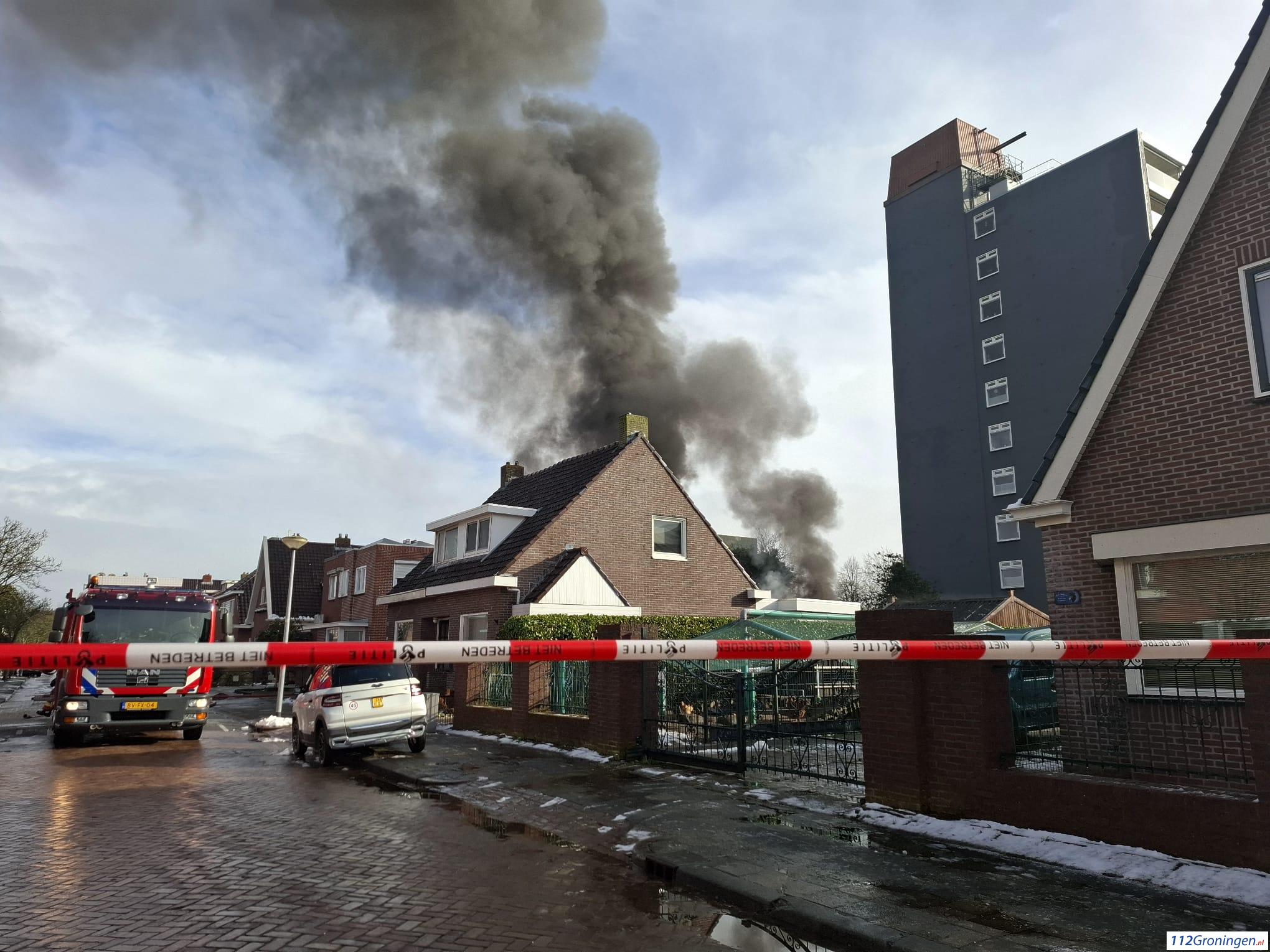 De brand is fors en bedreigt ook de aangrenzende woning. Ze doen er alles aan om overslag te voorkomen. Er was veel rookontwikkeling.