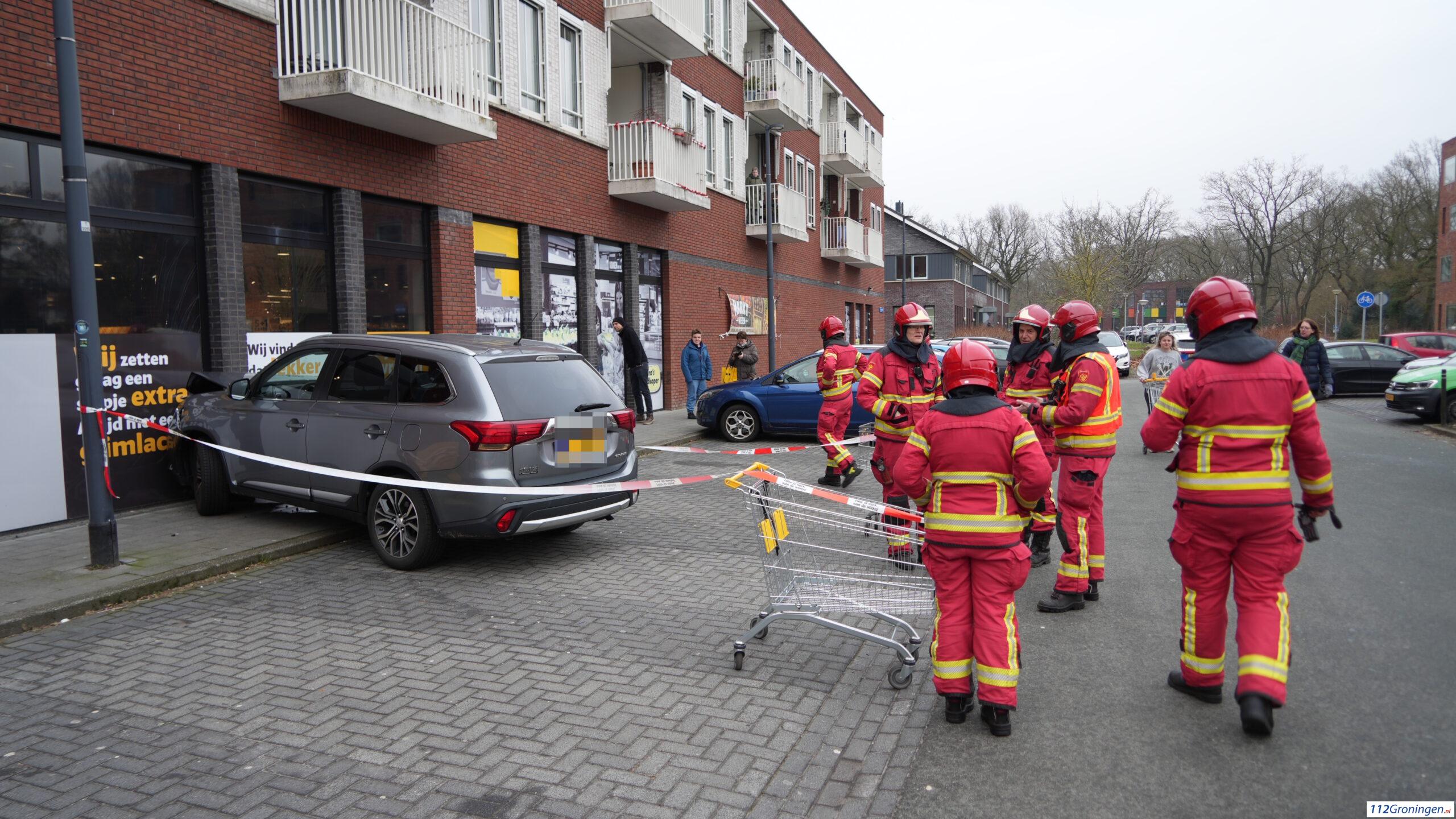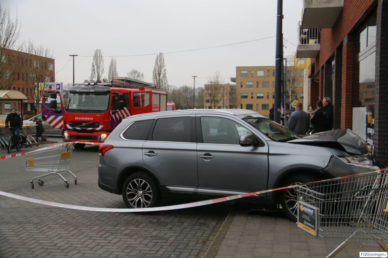 Haren – Bij de Jumbo supermarkt aan het Anjerplein is vrijdagmiddag een auto tegen de gevel gereden. De schade is groot. Hulpdiensten zijn ter plaatse. Niemand raakte gewond.
