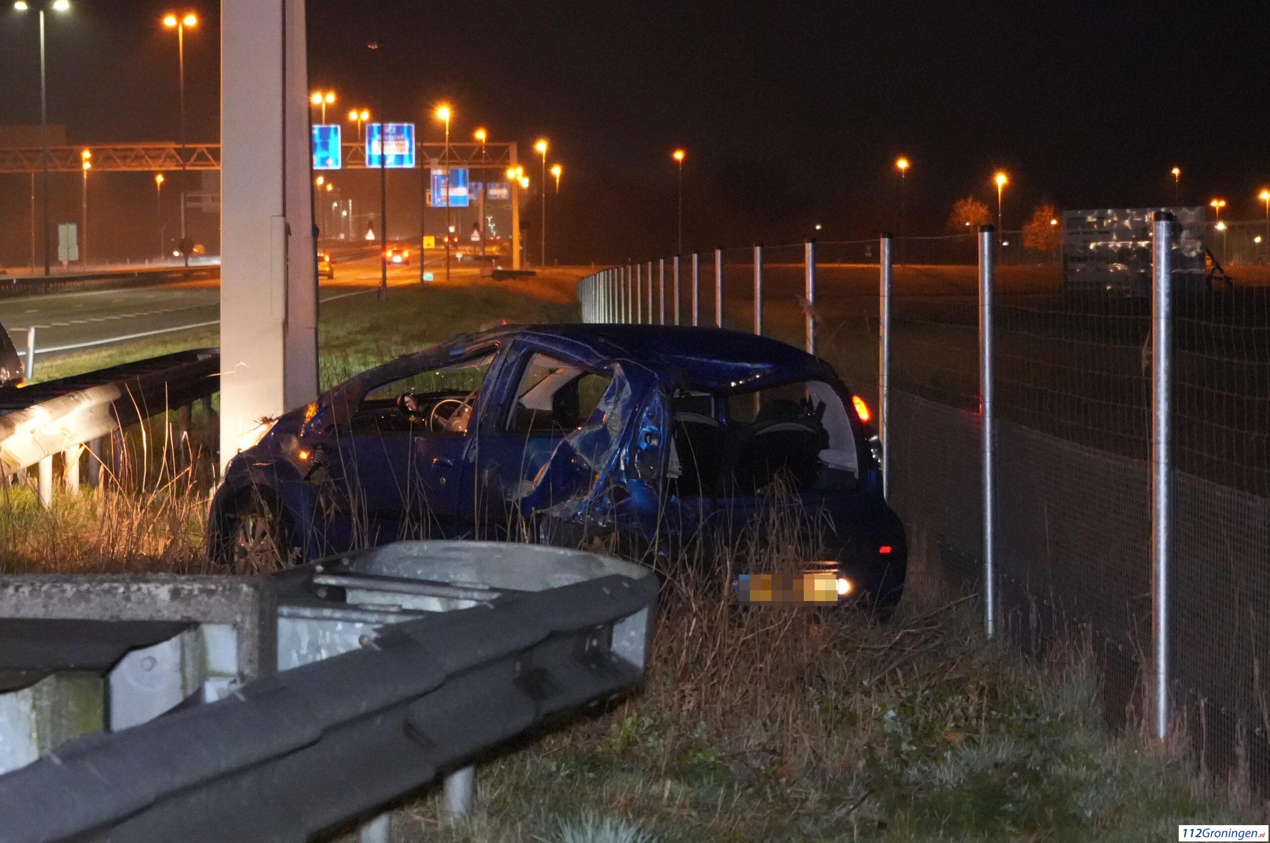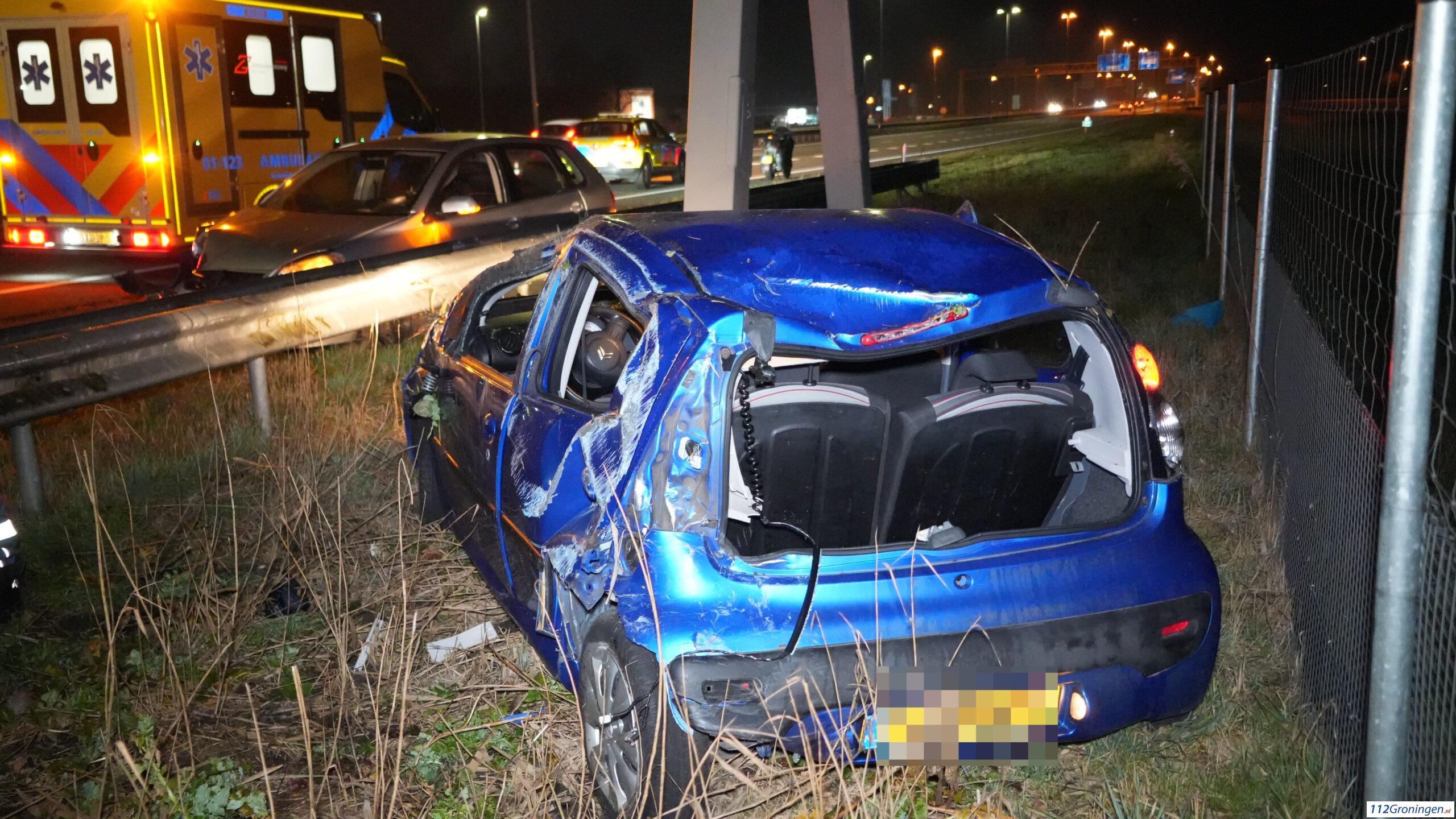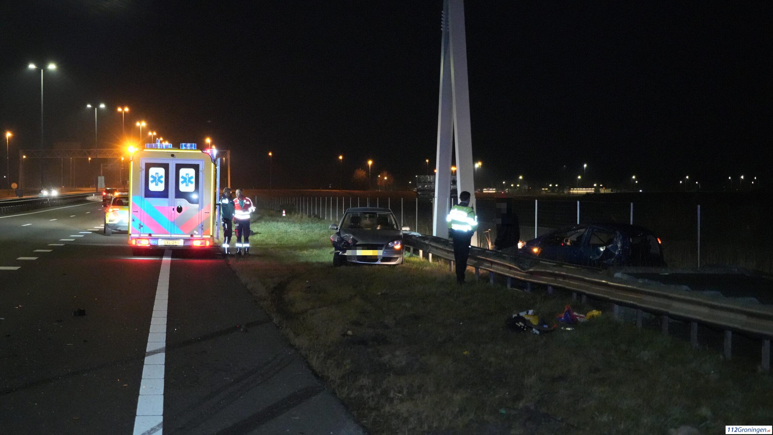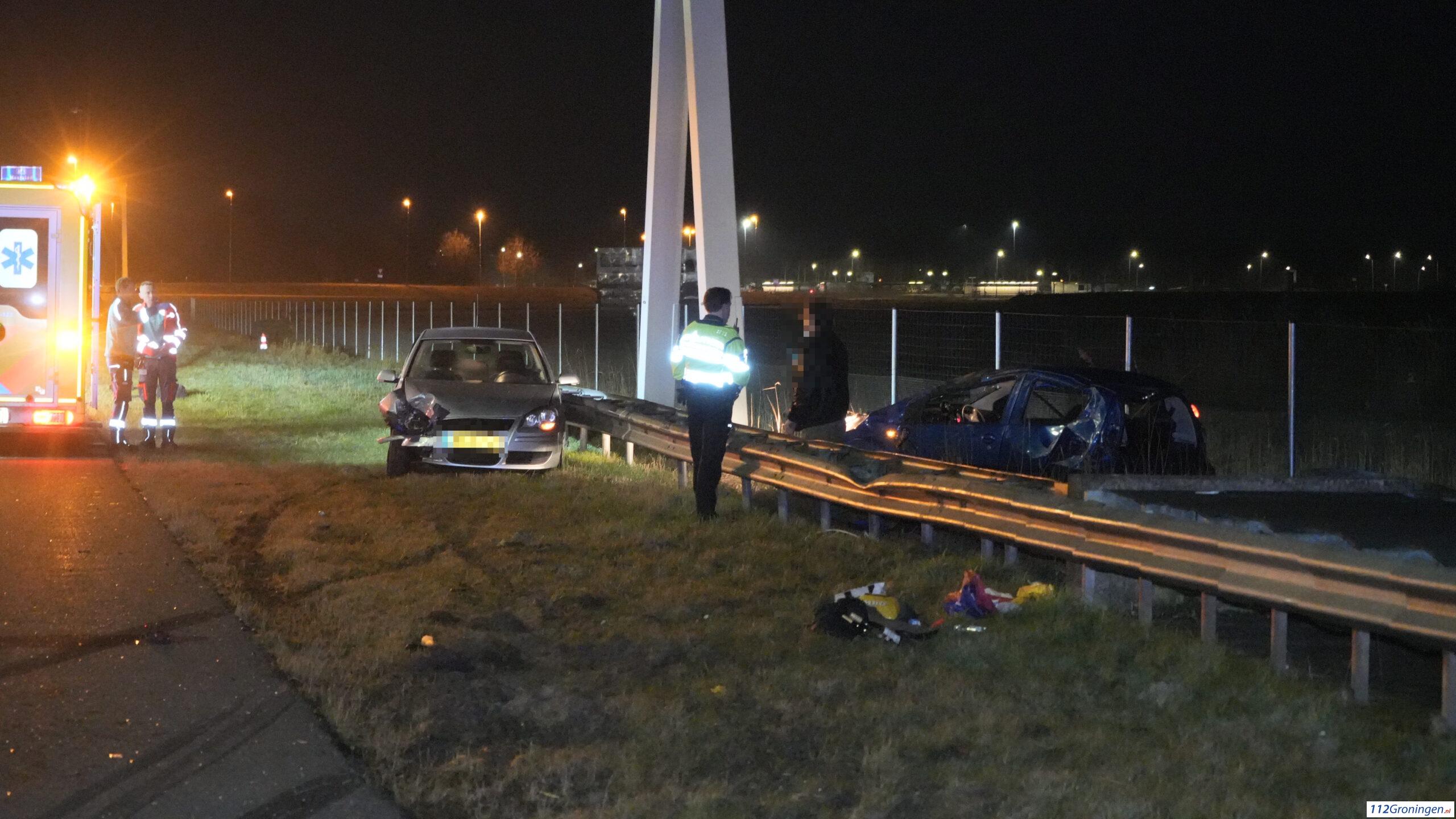 Groningen – Op de N46 tussen knooppunt Euvelgunne en de Ringweg Oost heeft woensdagavond rond 23.30 uur een forse aanrijding plaatsgevonden tussen twee auto’s. De schade was groot. Eén auto sloeg over de kop en belandde achter de vangrail. Het wegdek lag bezaaid met glas.