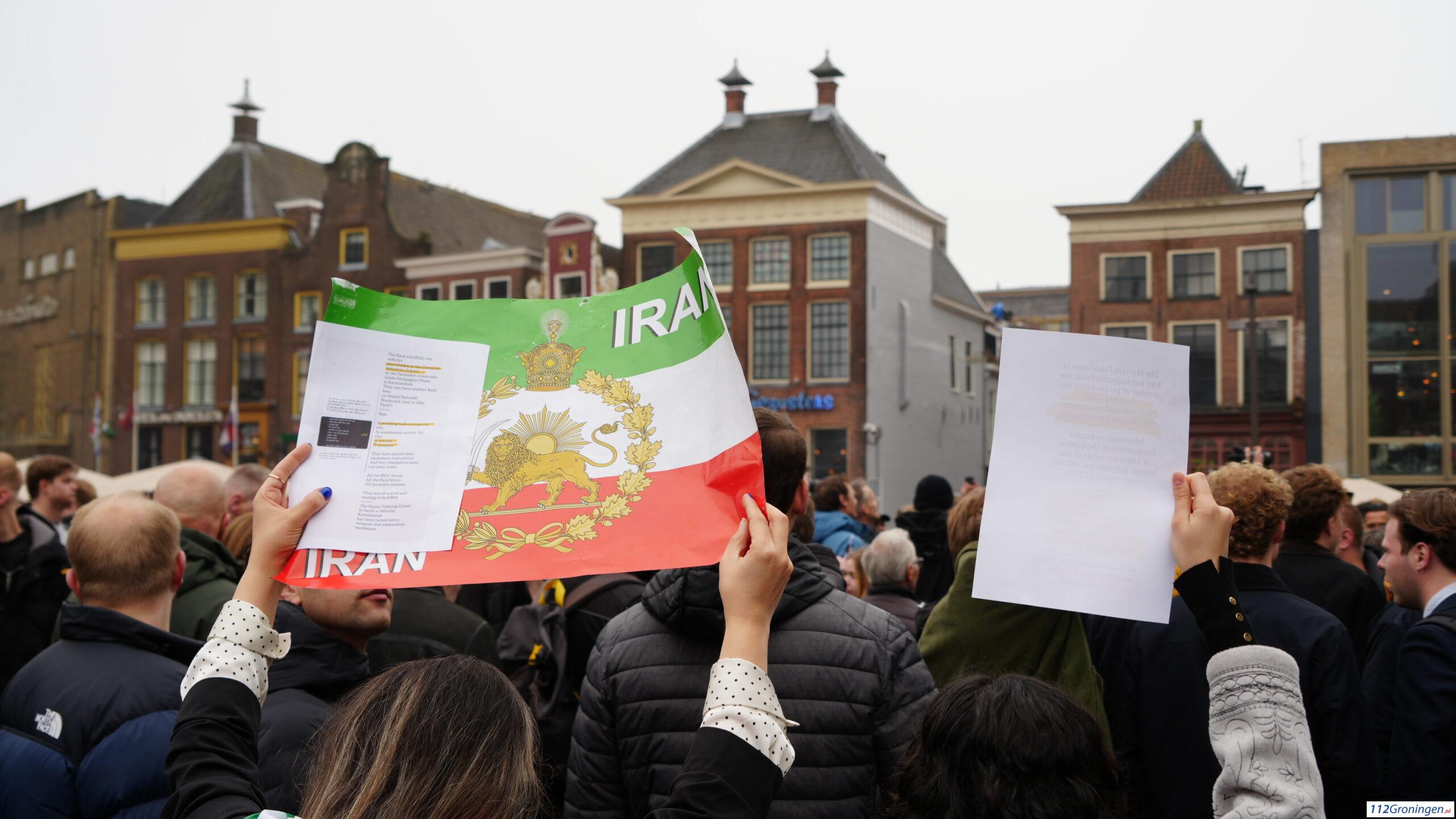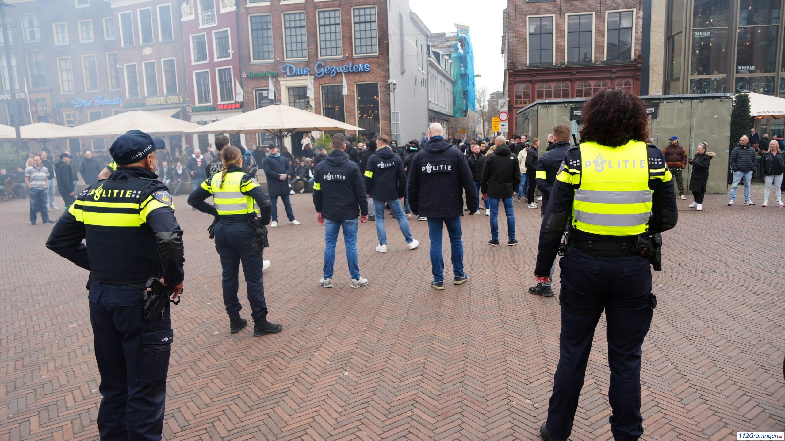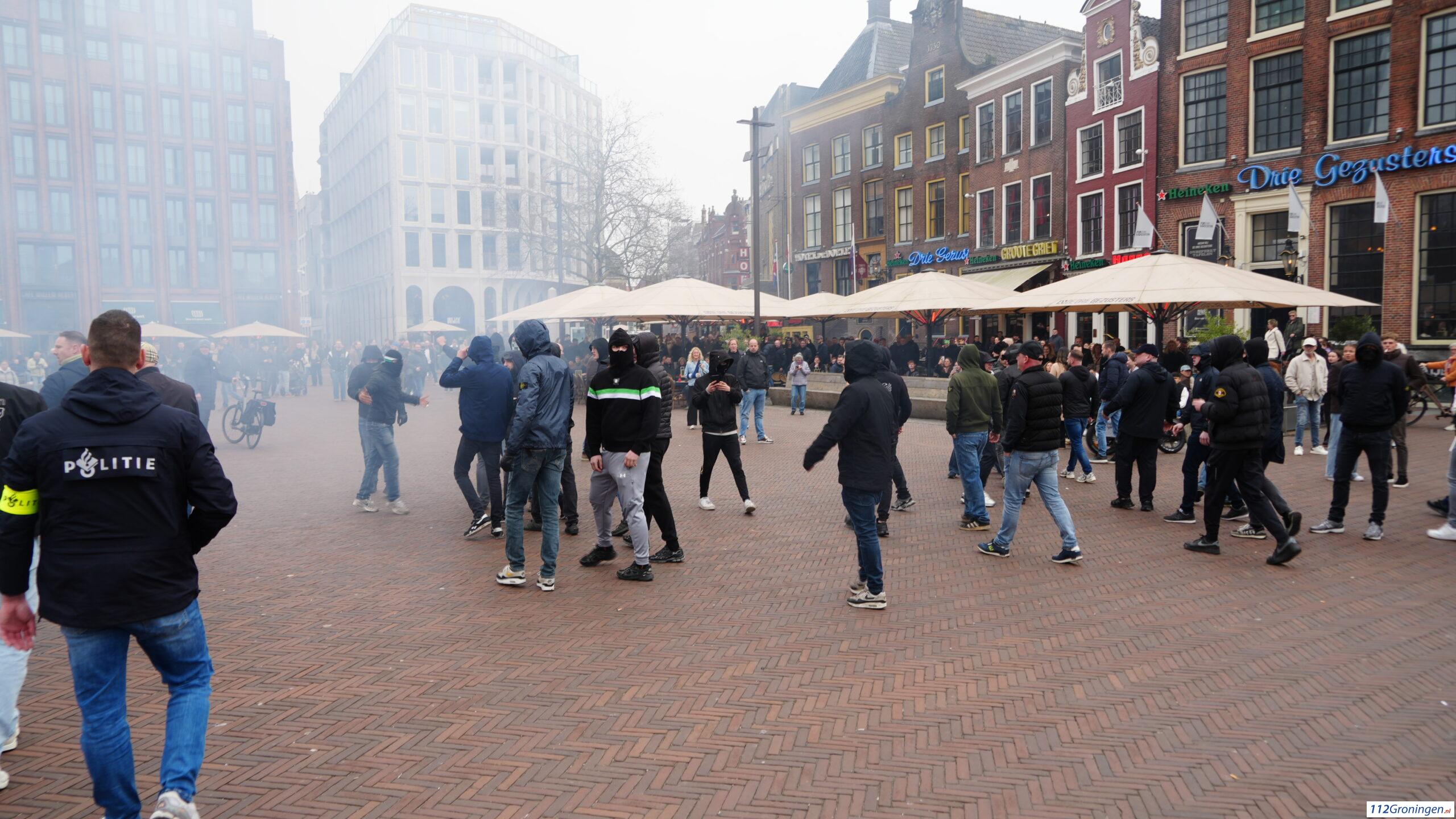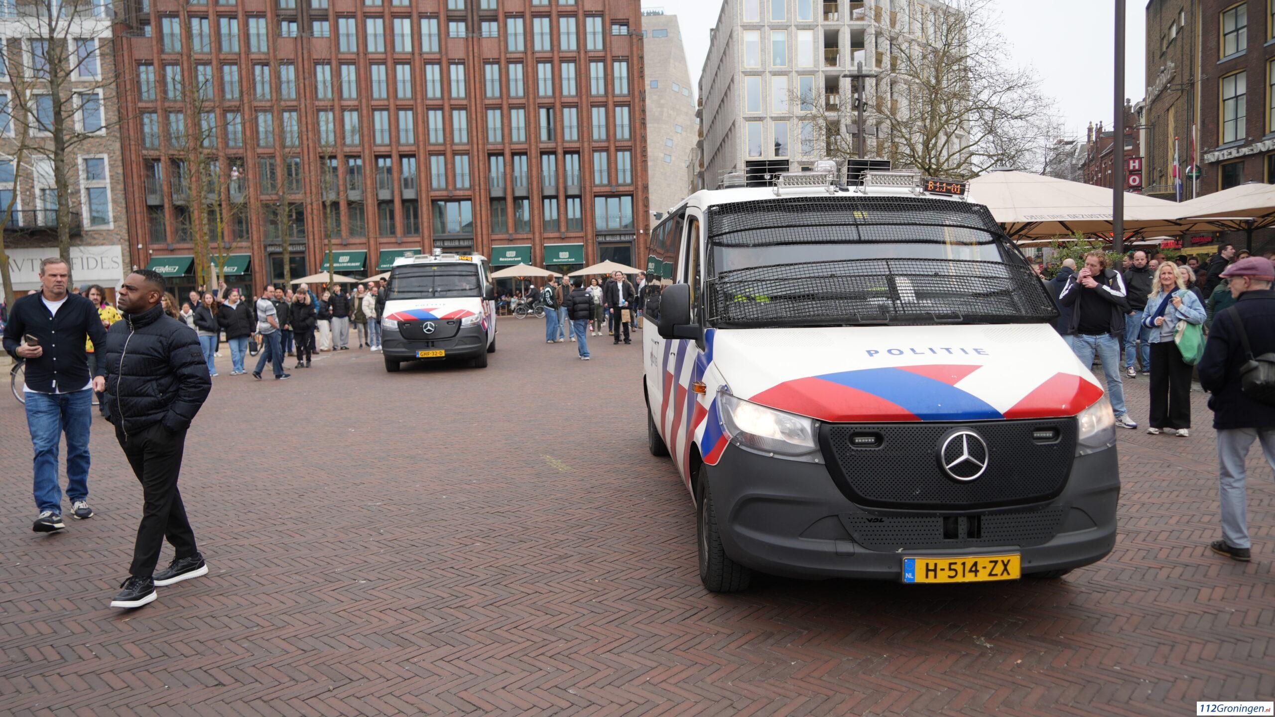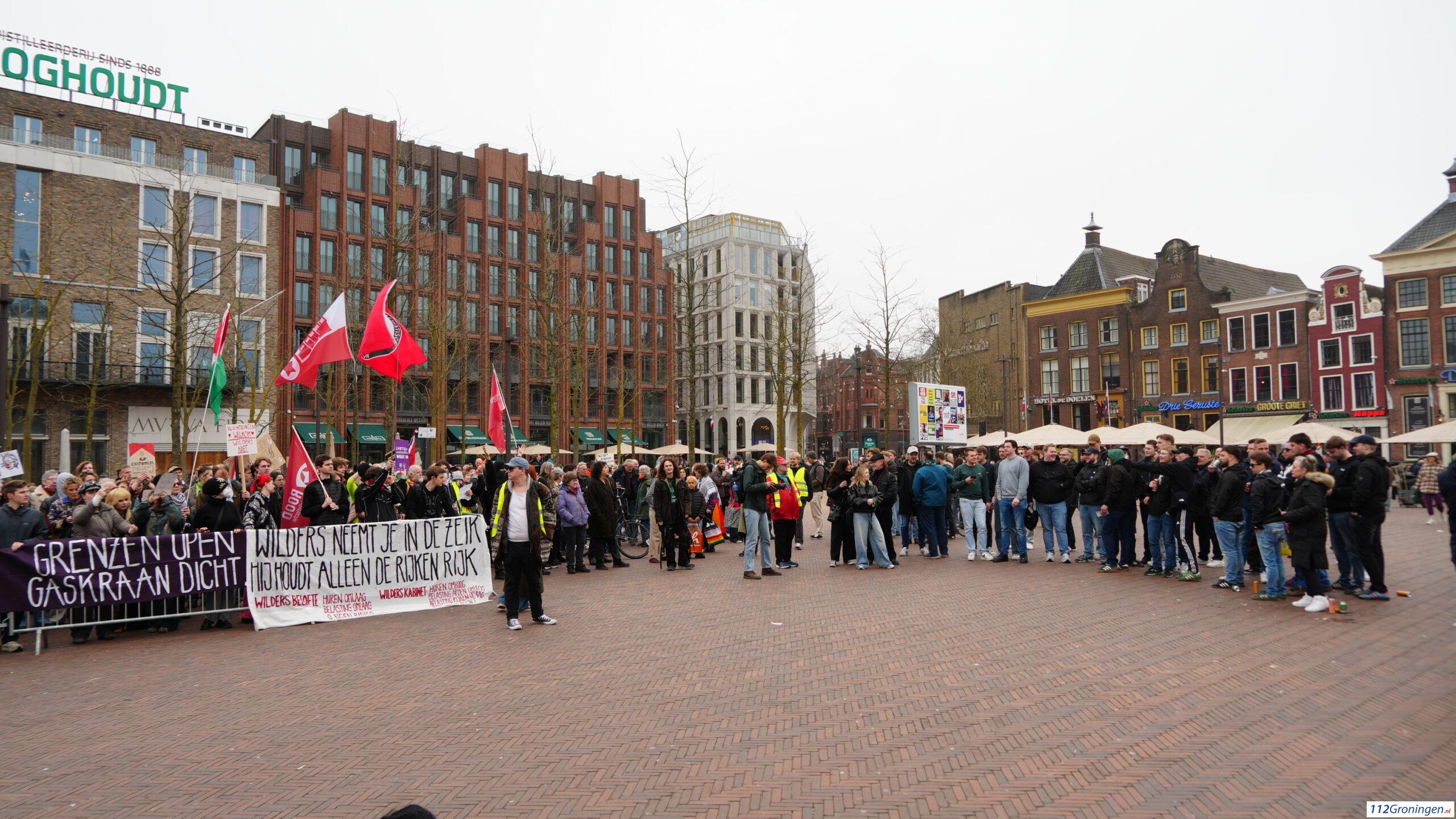 De groep demonstranten zijn gaan lopen richting de Vismarkt. De ME staat opgesteld op de Tussen Beide Markten. Het was wat onrustig.