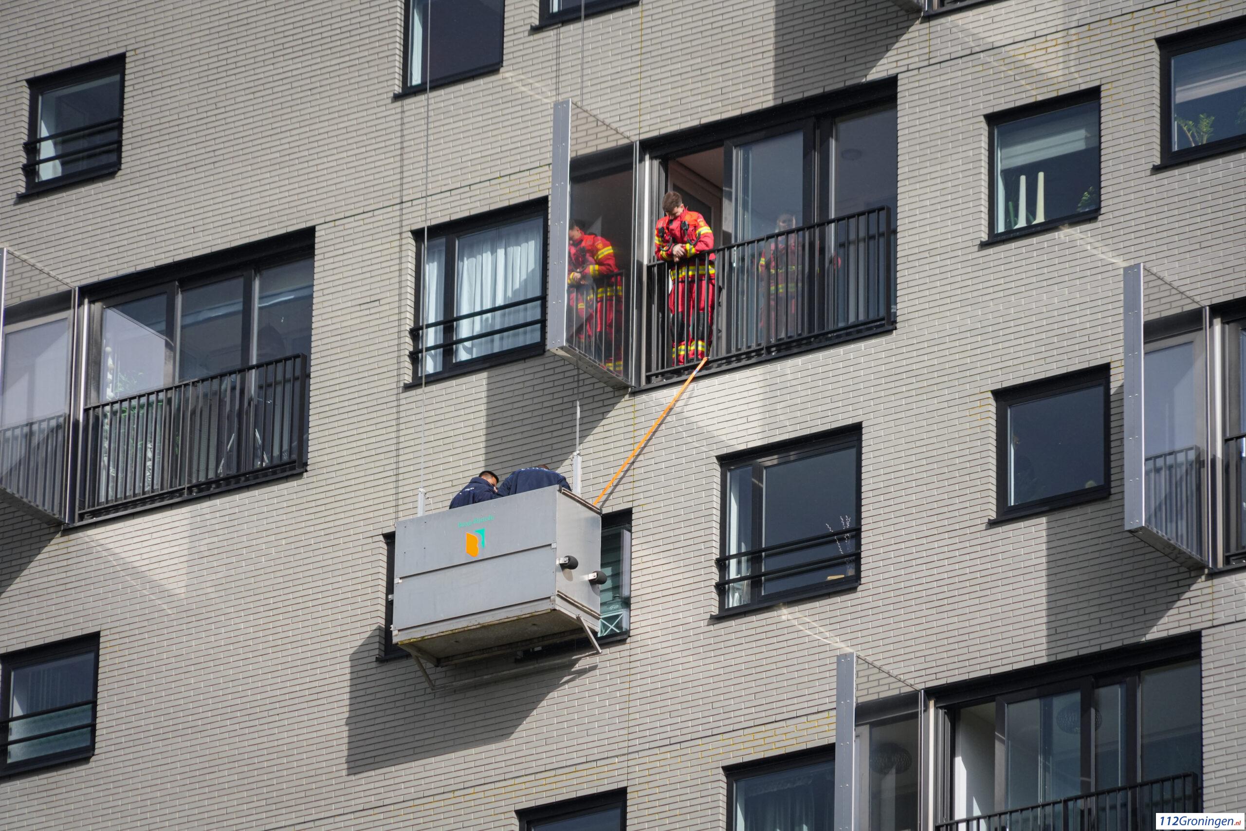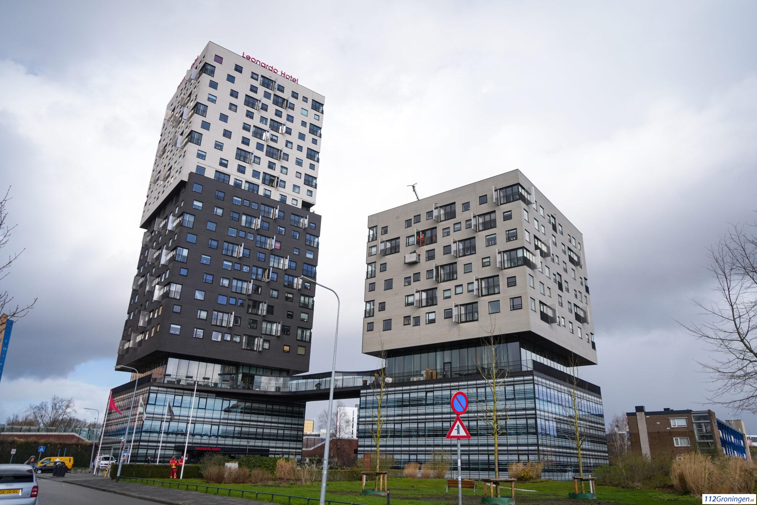 Even na 10:30 uur werd de brandweer gealarmeerd om de glazenwassers te redden. Ze zaten al sinds 08:30 uur vast, dat meldt een buurtbewoner aan 112Groningen.