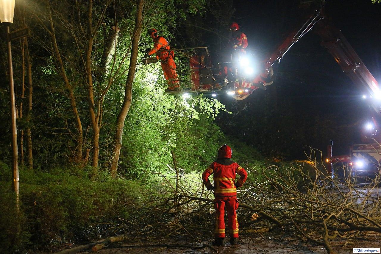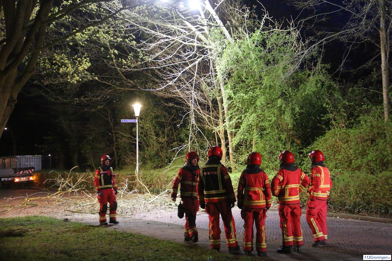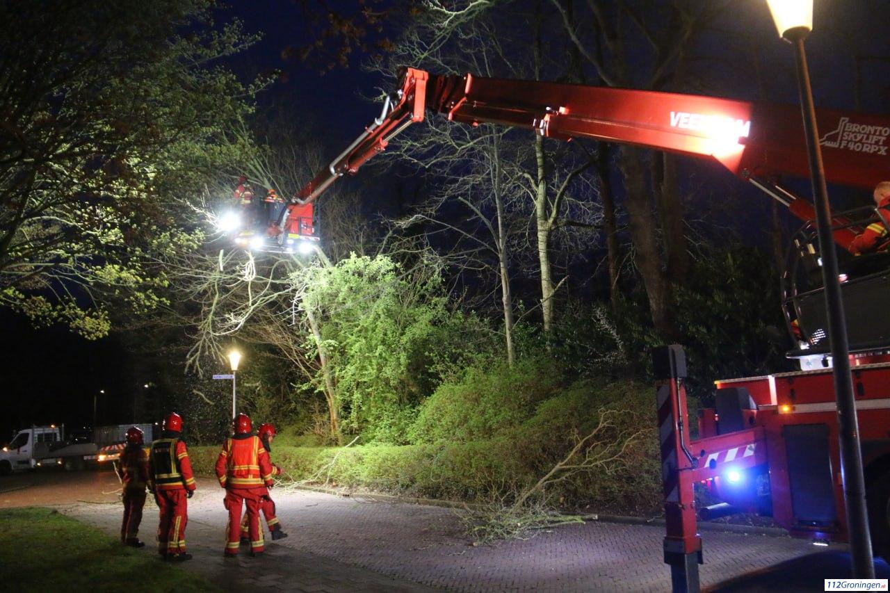 Veendam – Op de kruising van de G.H. Streurmanstraat met de H.J. Topstraat hing zondagavond een boom gevaarlijk boven de weg. De boom is vermoedelijk tijdens het onstuimige weer eerder vandaag bezweken.