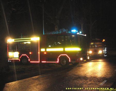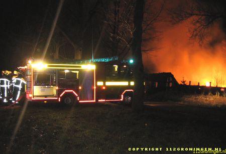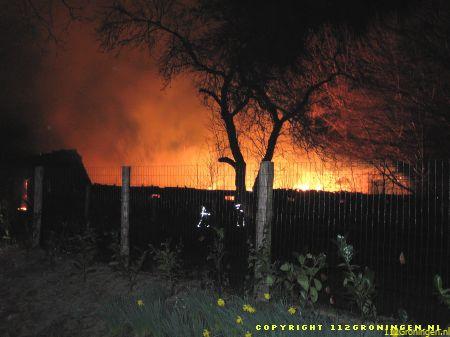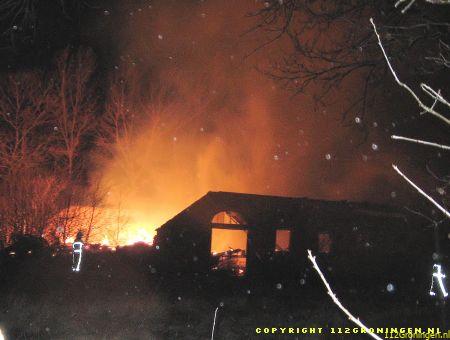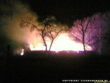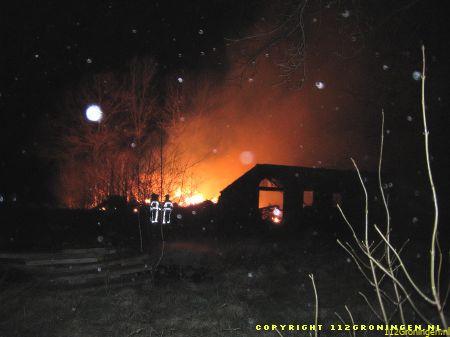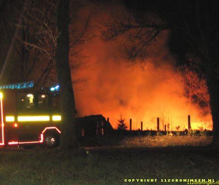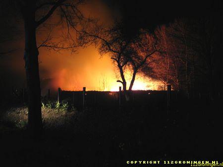 Noordbroek – Aan de Geert Veenhuizenweg in het buurtschap Stootshorn bij Noordbroek is vannacht een landbouwschuur tot de grond toe afgebrand. Buren werden wakker van een knetterend geluid en zagen het pand van voor tot achter in lichterlaaie staan, waarop zij direct 112 beldden. Toen brandweer en politie ter plaatse kwamen was het dak al ingestort en stonden alleen de buitenmuren nog overeind. In verband met in het pand aanwezige dieseltanks en kurkdroog stro, laaide het vuur hoog op en was er voor de brandweer weinig eer te behalen. In tegenstelling tot de melding, waren er gelukkig geen dieren in de schuur aanwezig. De buren hebben geluk gehad met de windrichting, aangezien de stevige wind al het vliegvuur over de weilanden joeg en niet richting hun huis. Volgens omwonenden had het pand geen gas- en electriciteitsaansluiting en brandstichting wordt dan ook niet uitgesloten. De politie heeft de Geert Veenhuizenweg enige tijd afgesloten. De circa 100 jaar oude schuur en de inboedel zijn verloren gegaan.(Tekst: Daniel / verslaggever 112Groningen)