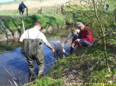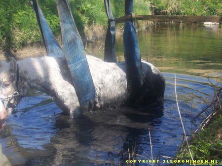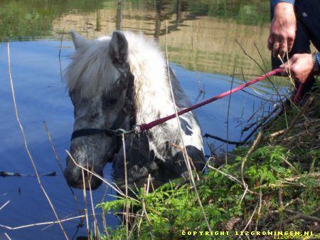 De brandweer heeft het paard er uit gehaald. Het paard lag vanaf 12.30 uur in het water en rond 14.05 uur was het weer op het droge.