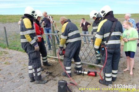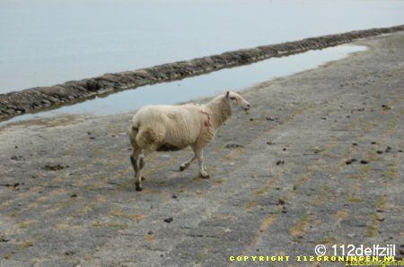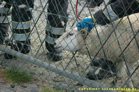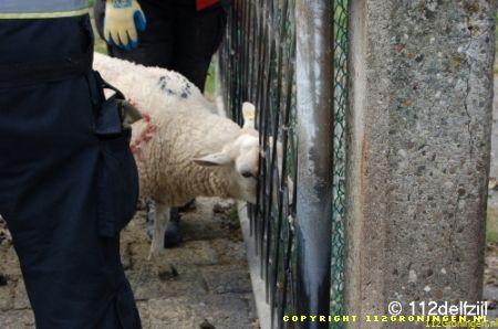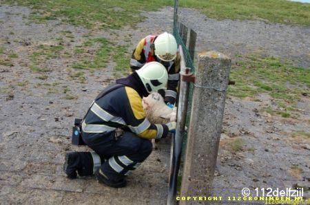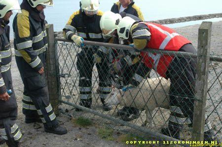 Delfzijl – Enkele wandelaars uit Delfzijl troffen zondagmorgen een schaap op de dijk, dat met zijn kop vast zat in een hek. Omdat ze zelf het schaap niet los konden krijgen hebben ze de brandweer gebeld. De 670 en 631 kwamen beiden met prio 1 terplaatse.