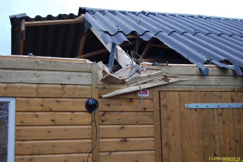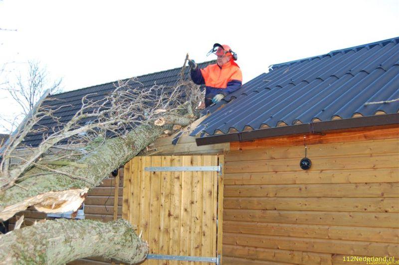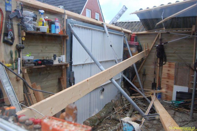 De auto die in de garage stond kon vrijwel ongeschonden naar buiten worden gereden. De boom in stukken gezaagd. Een tweede boom wordt uit voorzorg ook nog omgezaagd omdat deze ook niet meer erg vast in de grond staat.