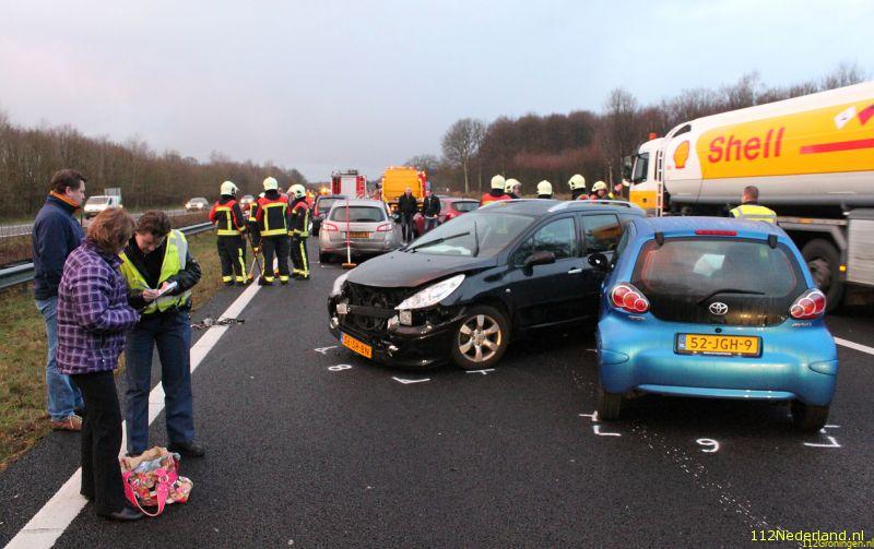 Spier - Een ravage op de A28 bij het Drentse Spier maandagochtend. Daar reden tien auto´s op elkaar.