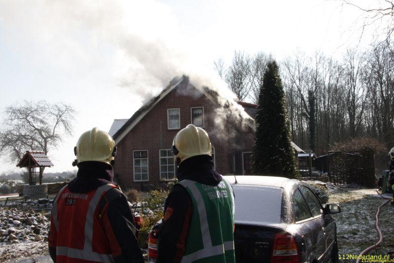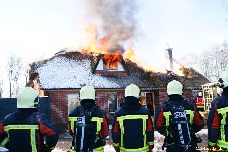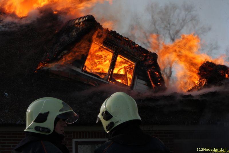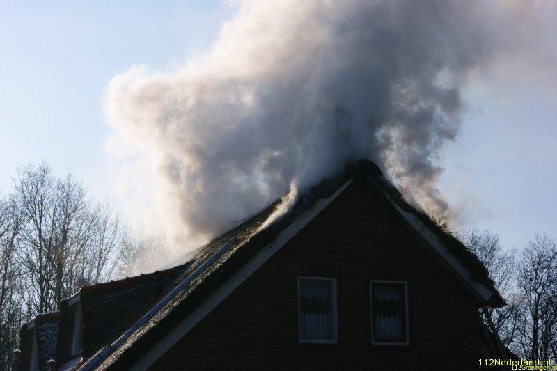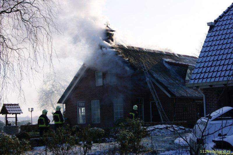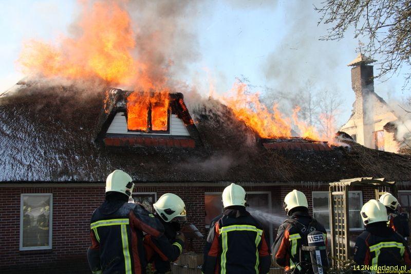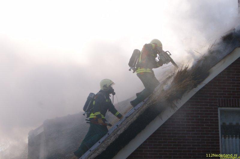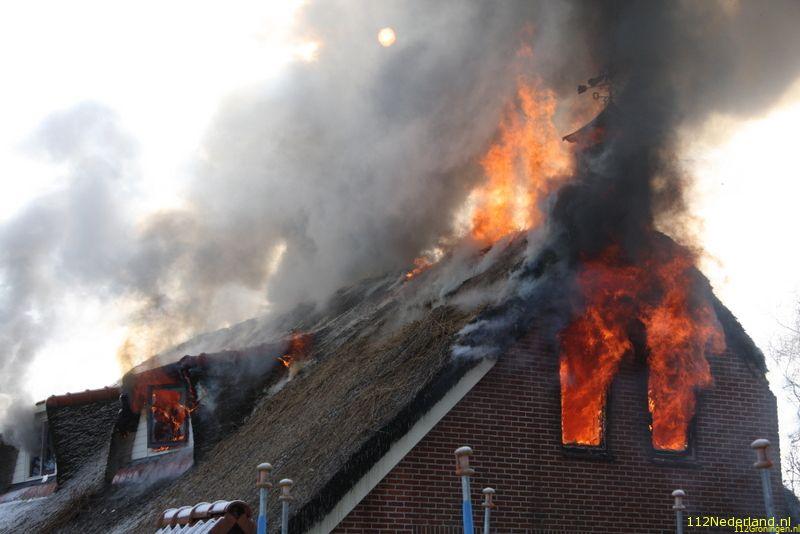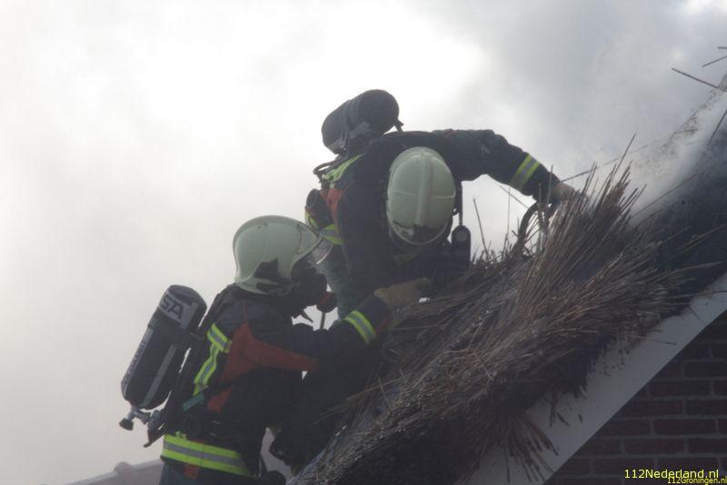 Toen de brandweer ter plaatse kwam was het vuur al overgeslagen naar de rieten kap. Al snel werd een tweede bluswagen opgeroepen en enkele minuten later werd ook het grootwatertransport gealarmeerd. Omdat de woning in het buitengebied staat moest het water uit een kanaal komen, een kilometer verderop aan de Ontsluitingsweg.
