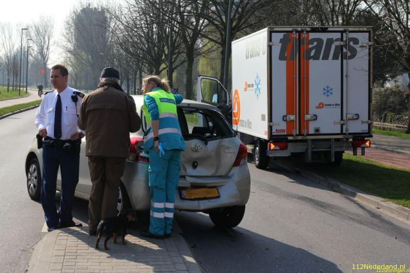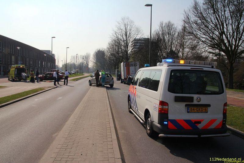 Daarbij raakte een vrouw gewond. Twee personenauto’s en een vrachtwagen kwamen kort voor twee uur in botsing. De bestuurster van de voorste auto is door de ambulancedienst uit haar voertuig gehaald. Dit gebeurde op een wervelplank om erger letsel te voorkomen. Zij is overgebracht naar het Vlietlandziekenhuis in Schiedam. De oorzaak van het ongeval is niet bekend. De Burgemeester van Haarenlaan is korte tijd afgesloten geweest tussen het Nieuwlandplein en de Troelstralaan.