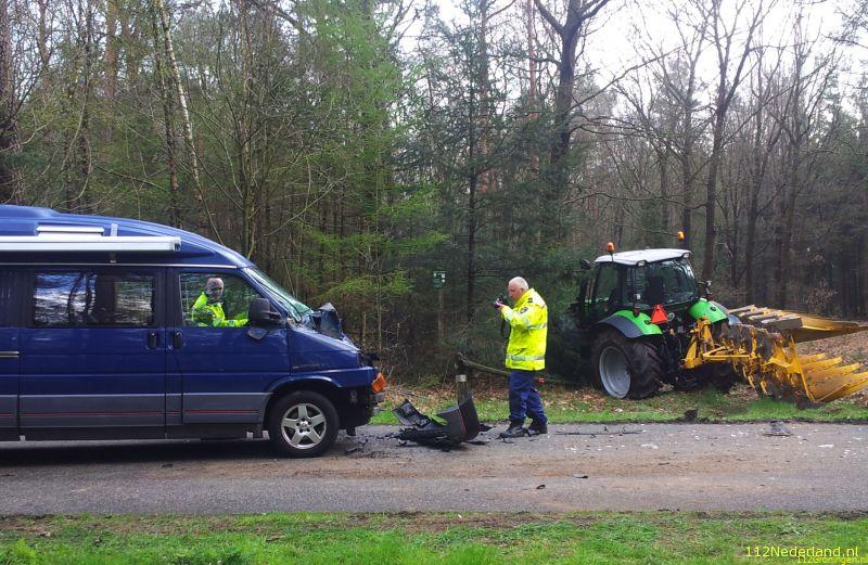 Terwijl de camper een tractor met ploeg inhaalde wilde de trekker een bosperceel links inslaan. De camper botste vervolgens tegen de achterband van de tractor. De tractor raakte dermate uit koer dat het in het bosperceel tot stilstand kwam. De camper bleef met ware schade op de weg achter. De chauffeur kwam er met wat spierpijn verder goed vanaf. ook de trekker chauffeur had wonderwel geen letsel. De verkeerd ongevallen analysegroep van de politie heeft de sporen va het ongeval voor hun verslag vast gelegd. Beide voertuigen zijn hierna afgesleept door een berger.