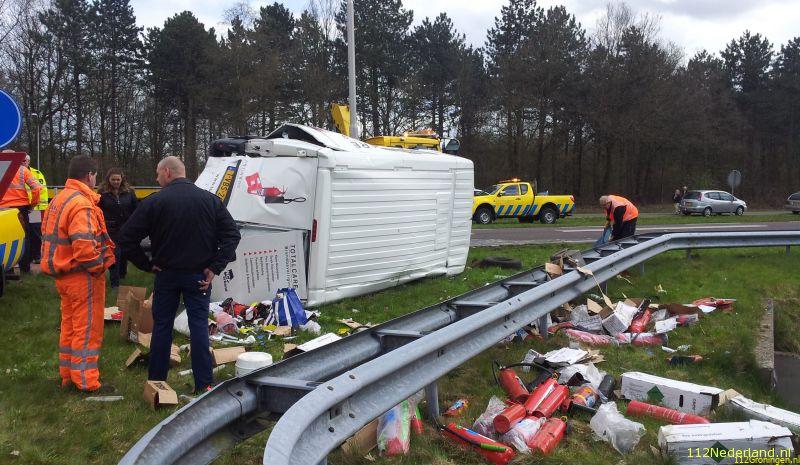 De tankwagen raakte het busje inde flank waarna het op de zijkant in de berm tot stilstand kwam. De brandblussers logendoor de klap uit het voertuig en kwamen in de berm terecht. De verkeers ongevallen analyse groep van de politie heeft de sporen van het ongeval vast gelegd voor hun verslag. Het busje raakte bij het ongeval totaal vernield. Ook de tankwagen had forse schade en moest worden afgesleept.