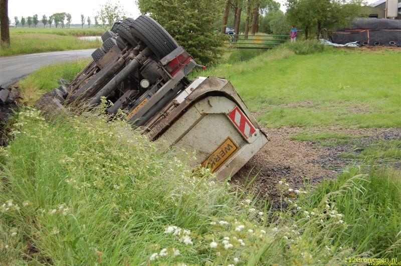 Met als gevolg dat deze op de kop in de sloot terecht kwam. De vrachtwagen was beladen met 30 ton puin granulaat. Dit werd eerst gelost door een graafkraan. Berger Poort uit Hoogkerk heeft de wagen daarna met de telekraan weer vakkundig op de weg gezet en daarna rond 20:00 uur afgevoerd. De weg was uren gestremd.