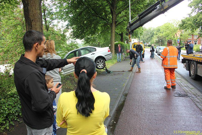 De Stadjer reed met de auto het water van de Wilhelminakade in en belandde tussen twee woonboten. Twee omstanders uit Groningen bedachten zich niet en sprongen het water in. Met behulp van beide koene redders kon 50-jarige bestuurder uit zijn benarde positie worden gered. Het slachtoffer en zijn redders werden door omstanders op het droge geholpen. Er raakte niemand gewond bij het incident. De auto werd door een bergingsbedrijf geborgen. De politie is zeer te spreken over het accurate optreden van de 23- en 46-jarige Stadjers.