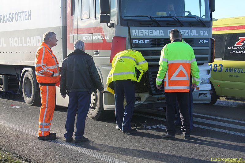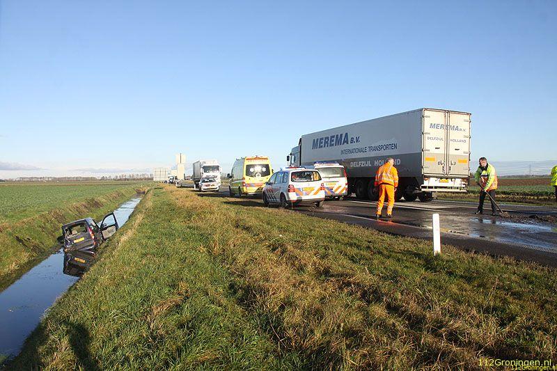 De auto belandde na de aanrijding in de sloot. De bestuurder is door medewerkers van de ambulancedienst gecontroleerd op verwondingen maar die bleek hij niet te hebben. Een bergingsbedrijf heeft de auto uit de sloot gehaald, de vrachtwagenchauffeur kon zijn rit naar Delfzijl met schade vervolgen.