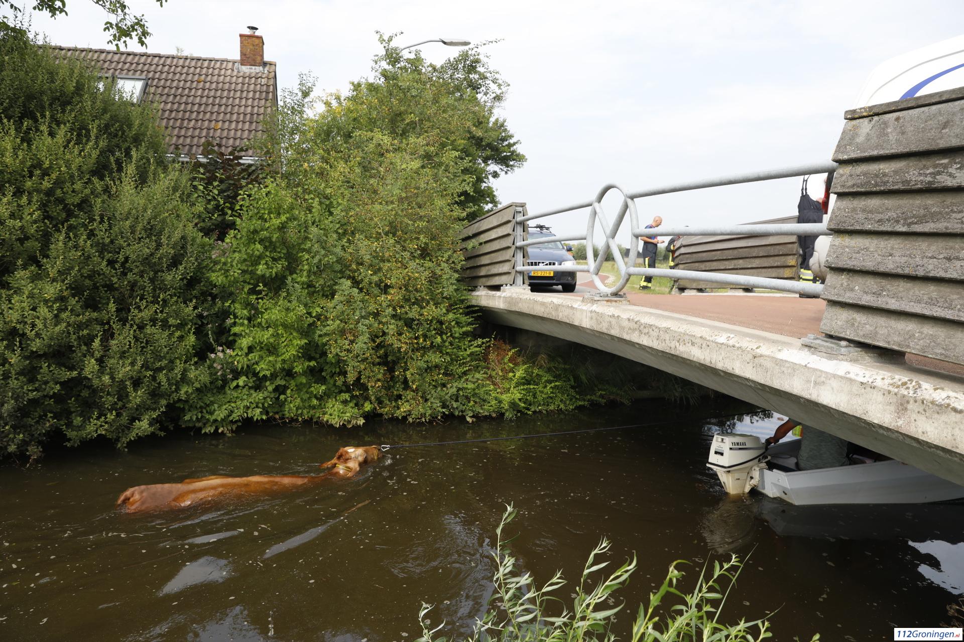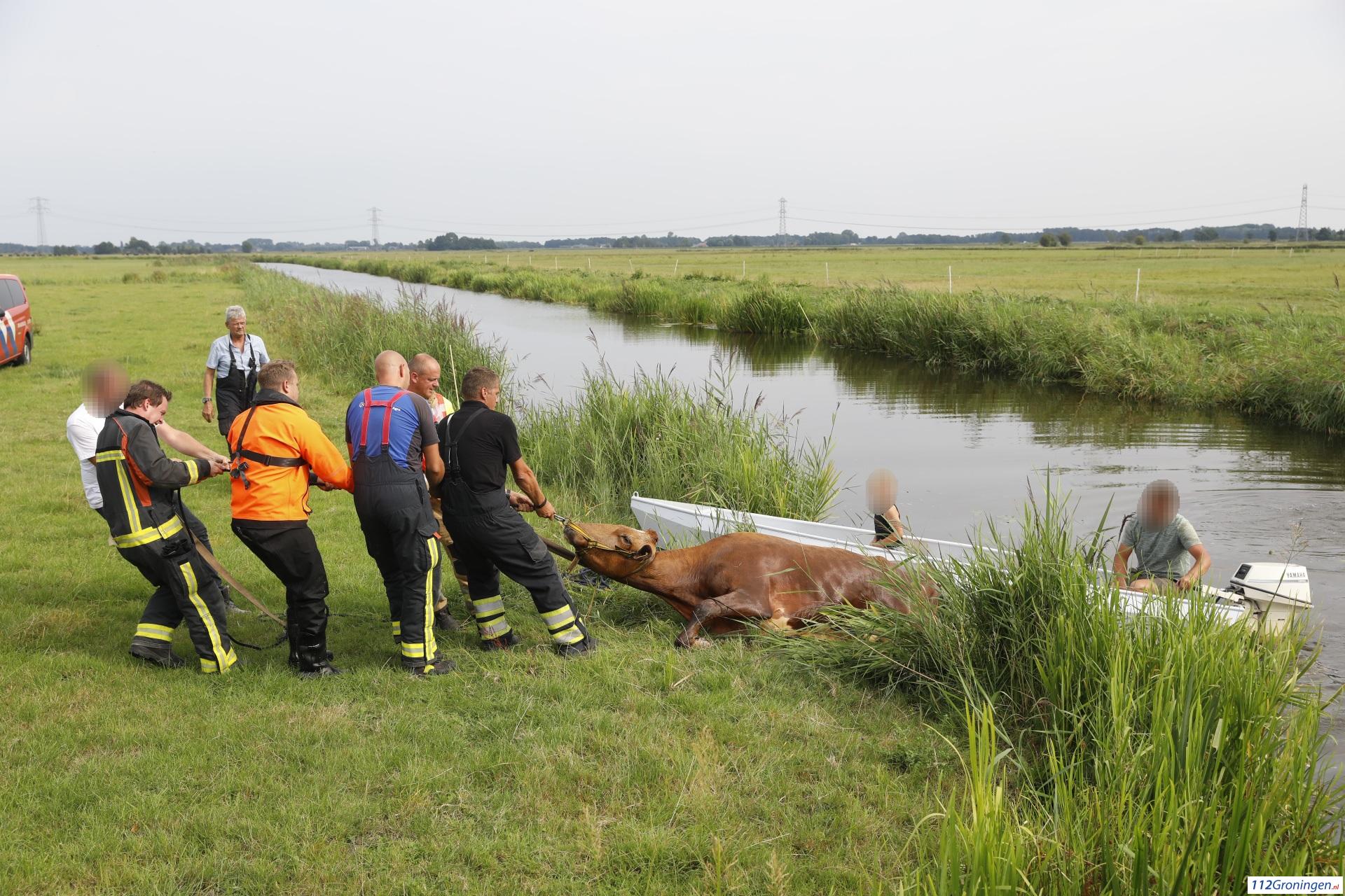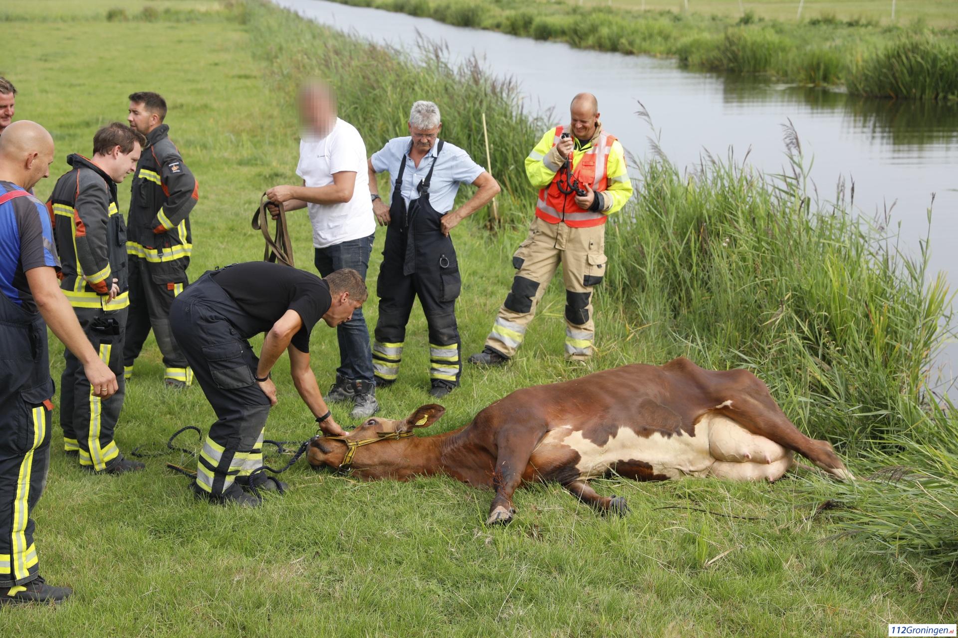 Bij het weiland is de koe er door de brandweer van Zuidhorn uit het water getrokken. De koe was vanwege de zwemtocht en de stress erg moe, na een paar minuten kon de koe weer op eigenkracht opstaan.